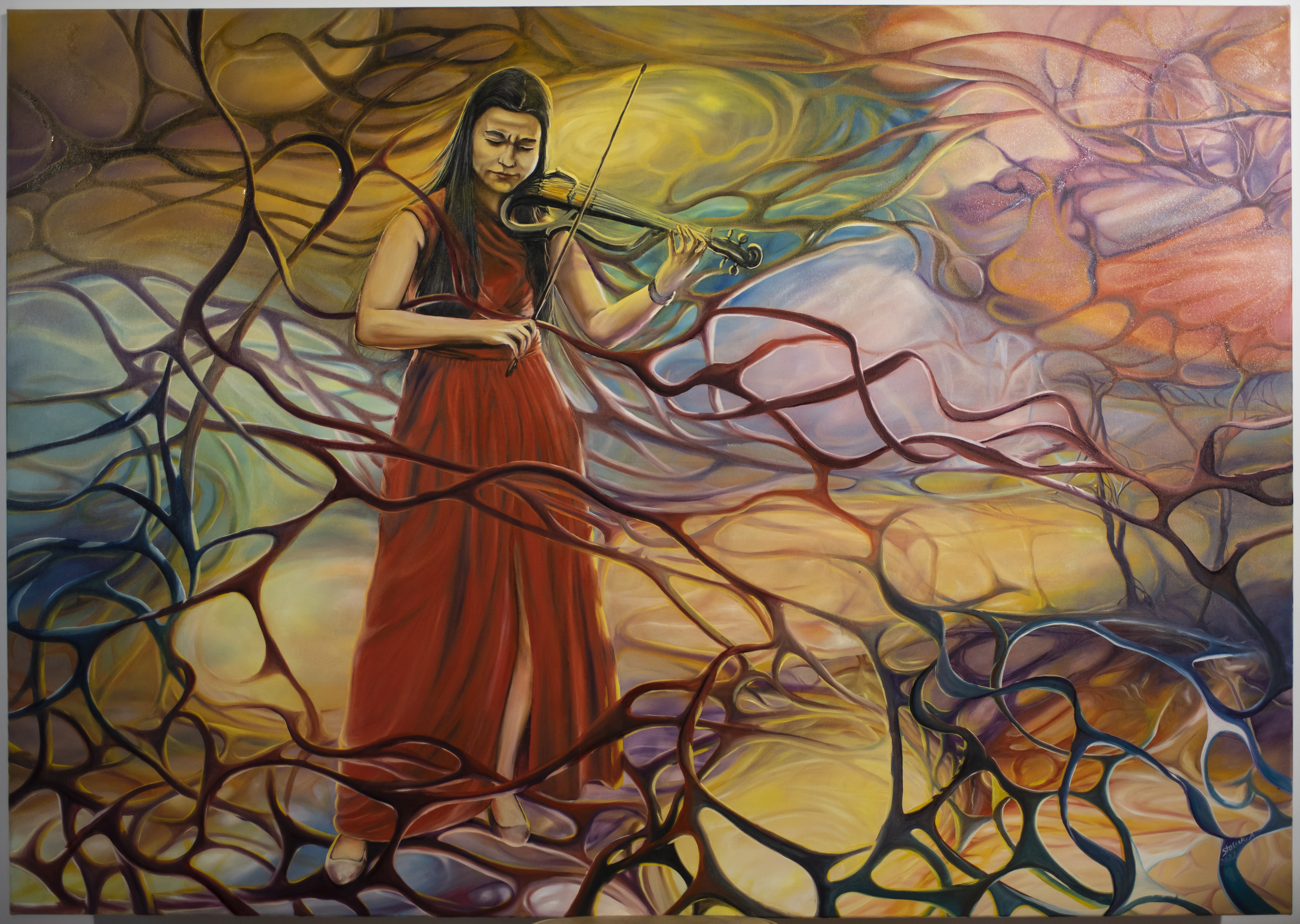 Wiesz co? To jest taki obraz, który od razu przyciąga wzrok. Wielobarwne smugi i linie oplatają kobietę w czerwonej sukni grającą na skrzypcach. Jej twarz pełna jest skupienia, jakby muzyka była jedynym, co się liczy w tym magicznym momencie. Otoczenie przypomina abstrakcyjne krajobrazy, gdzie kolory płynnie mieszają się ze sobą: żółcie, fiołki, odrobina chłodnego błękitu. Te wszystkie odcienie tworzą dynamiczną kompozycję, jakby były w nieustannym ruchu. Atmosfera jest pełna spokoju, ale i tajemnicy. Artystyczny styl jest nieco surrealistyczny. Artysta posłużył się płynnymi kształtami i falującymi liniami, żeby dodać obrazowi dynamiki. Można poczuć, że dźwięki skrzypiec dosłownie ożywiają przestrzeń wokół. I tak sobie myślę, że obraz wyraża jedność człowieka z naturą, gdzie muzyka jest tym magicznym linkiem. One są jak magiczne drzewka! A dziecko powiedziałoby: wiesz, ten obraz jest jak sen. Dla mnie, to jest piękny "dreamscape", który skłania do refleksji i chwili zatrzymania. Stoi się i patrzy, i nie chce się przestać.