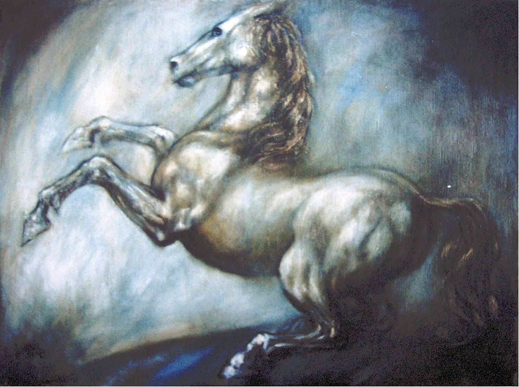 emotional, spectacular painting, depicting a bulging half-wild unbroken horse