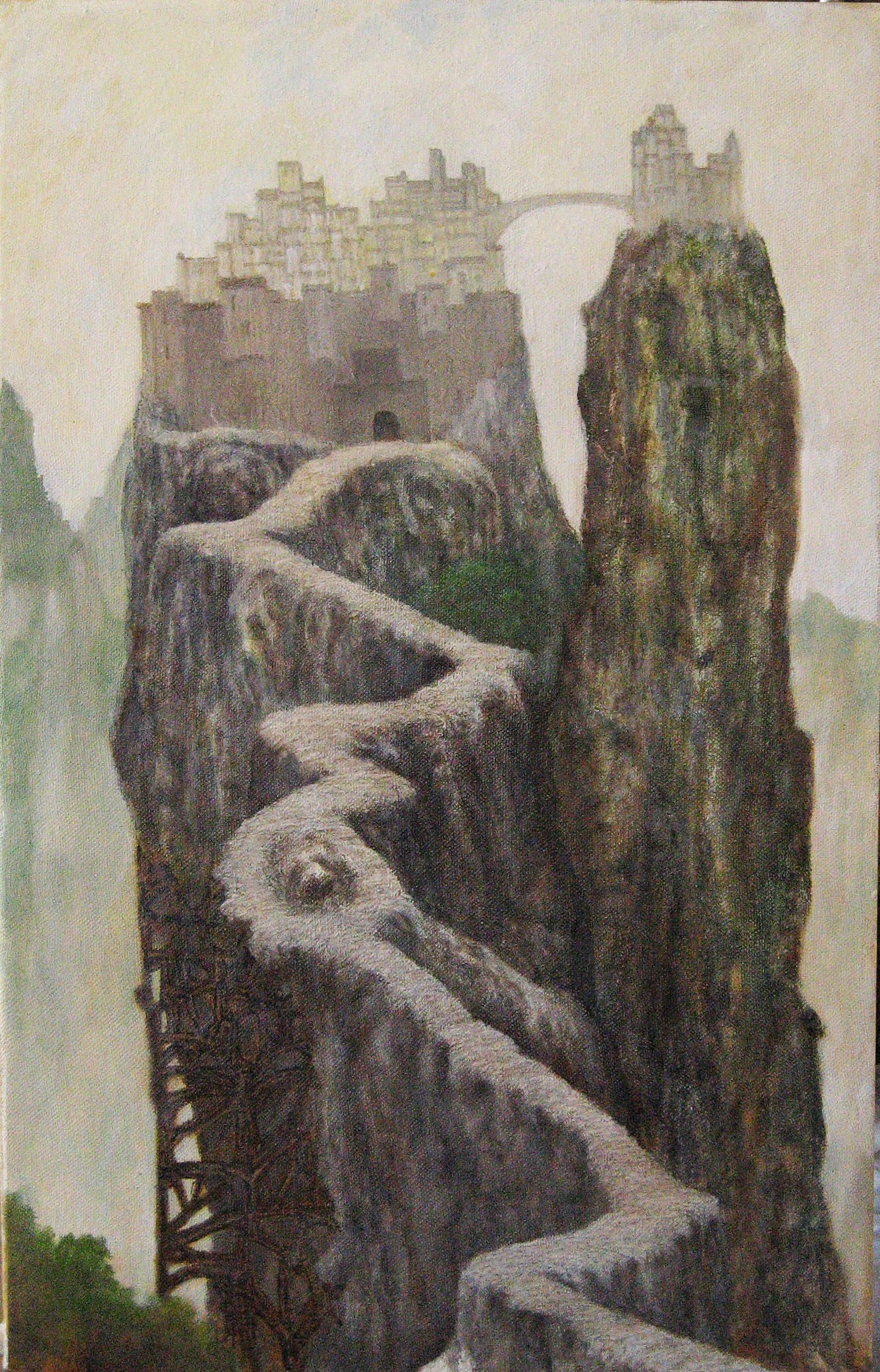 Na obrazie widzimy niezwykle malowniczą kompozycję, która przyciąga wzrok swoją pionową dynamiką. Dominują tu stonowane, ziemiste barwy – szarości, brązy, oraz subtelne nuty zieleni. Pośrodku kadru uwagę skupia kręta ścieżka, wijąca się po skalistym urwisku niczym serpentina. Całość prowadzi wzrok ku tajemniczemu miastu architekturą przywodzącemu na myśl średniowieczne budowle, które skąpane są w subtelnej mgiełce. Atmosfera tego dzieła jest pełna tajemnicy i niepewności, jakby otaczała nas cisza przed burzą. Styl obrazu zachwyca swą surrealistyczną nutą. Artyści często sięgali po takie techniki, by wzbudzić w odbiorcy poczucie zagubienia czy zdumienia. Ścieżka jest naprawdę wysoka i trochę straszna! Może niektórym przypominać podróż w nieznane, budząc jednocześnie fascynację i lekki dreszcz. Kto by nie chciał połazić takim szlakiem? Obraz zaprasza nas do refleksji nad podróżą życia, gdzie każda decyzja to krok po niepewnym gruncie. Możemy poczuć się jak odkrywcy w nieznanym świecie, pełnym sekretów i niespodzianek – really mysterious!