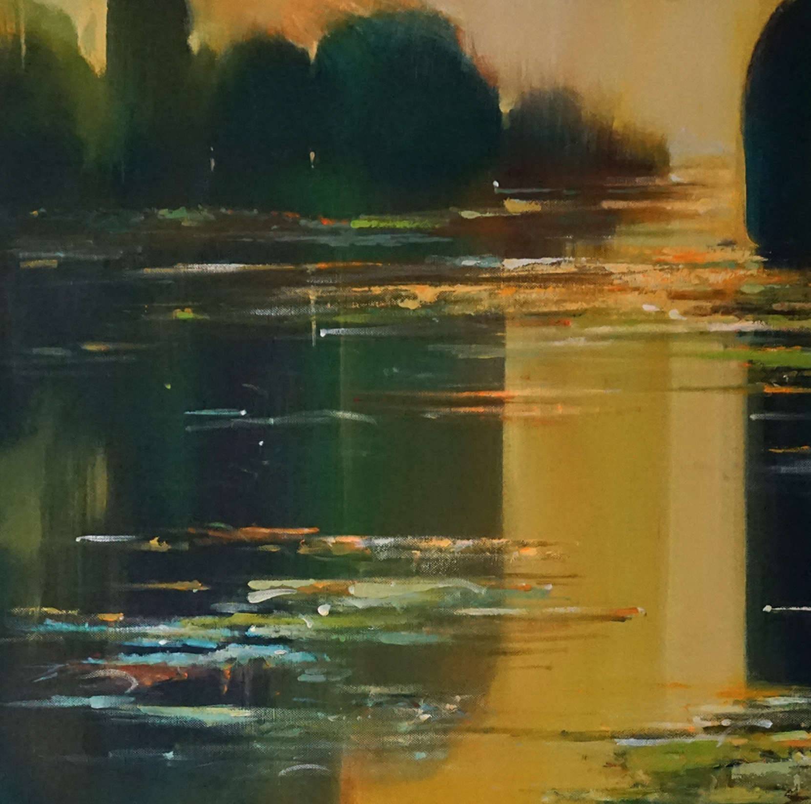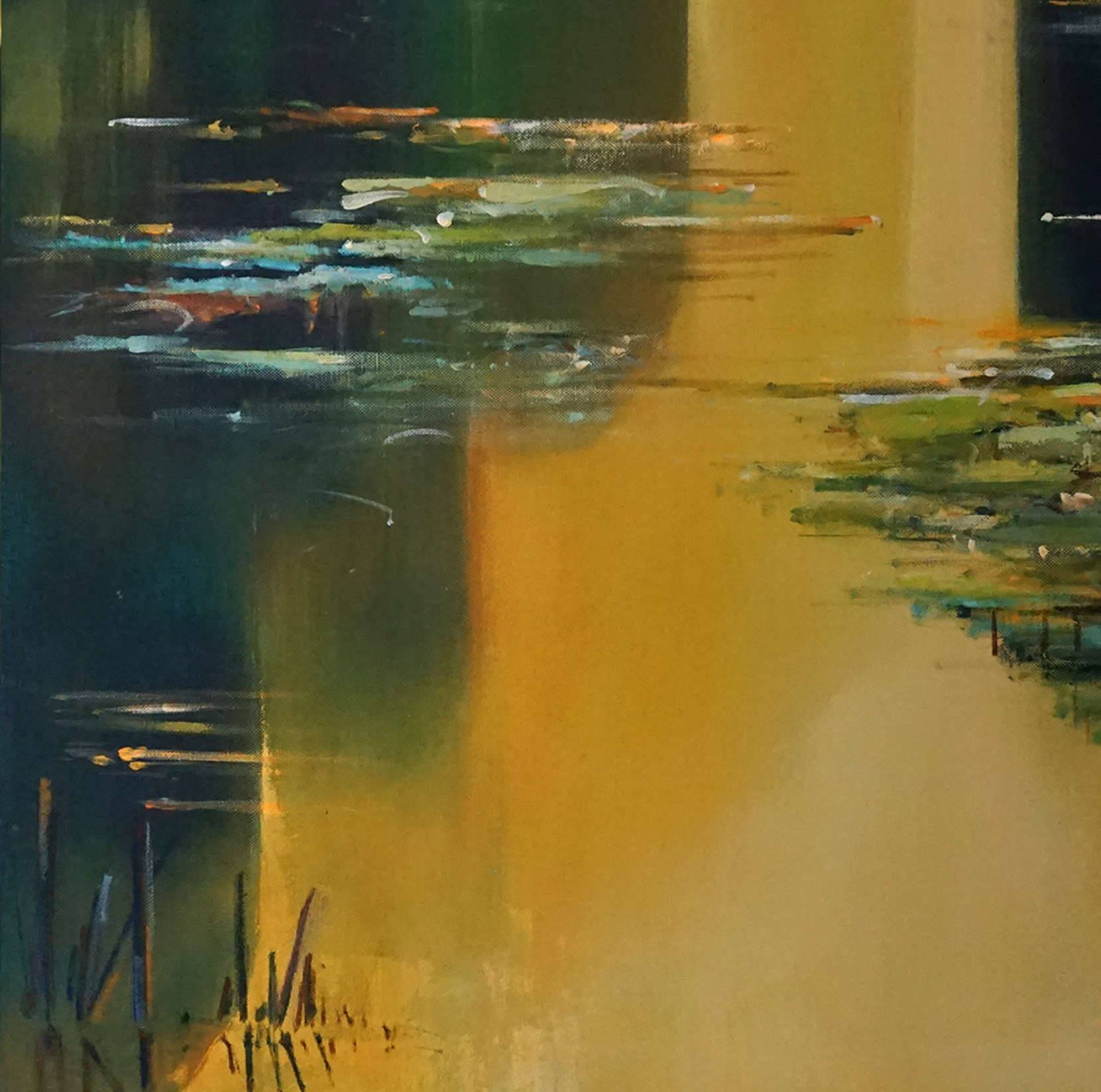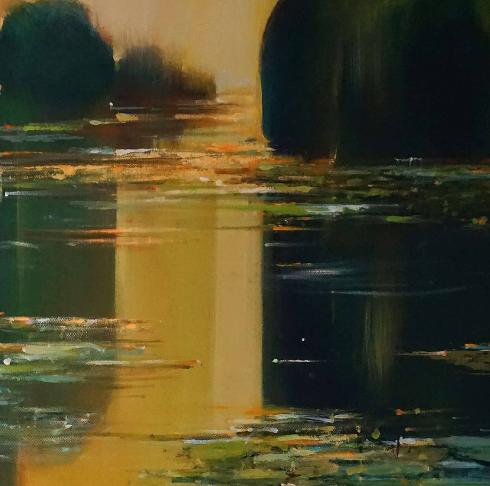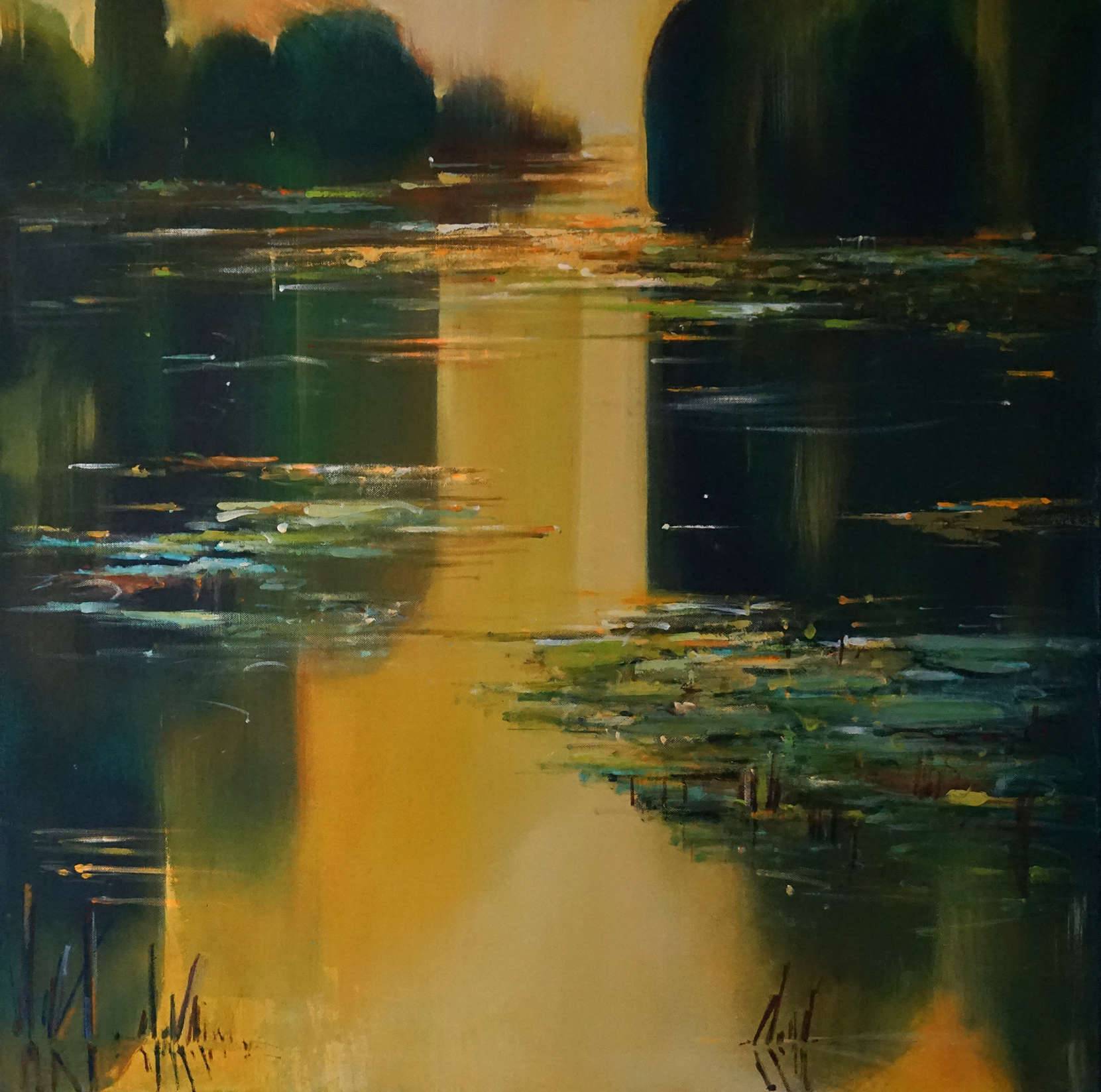 Niezwykle nastrojowy pejzaż, spojrzenie na rzekę podczas zachodu słońca. Obraz namalowany farbami akrylowymi z dodatkiem pasteli olejnych na płótnie, naciągniętym na sosnową ramę. Praca posiada zamalowane boki, zabezpieczona jest werniksem. Z tyłu obrazu znajduje się zawieszka, zatem obraz gotowy jest do zawieszenia na ścianie. Obraz sygnowny: Adamczak 2021