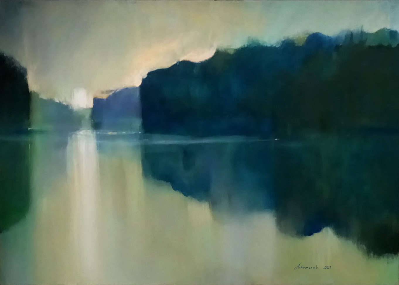Nastrojowy, pełen zadumy pejzaż przedstawiający rzekę o zachodzie słońca. Płótno naciągnięte na blejtram o wymiarach 50cm x 70cm. Pejzaż wykonany w technice akrylowej, zawerniksowany, ma pomalowane boki. Z tyłu obrazu znajduje się zawieszka, zatem obraz gotowy jest do powieszenia. Obraz wykonany na plenerze Krotoszyn 2021 Wymiary: 50x70 Oprawa: bez ramy Rok powstania: 2021