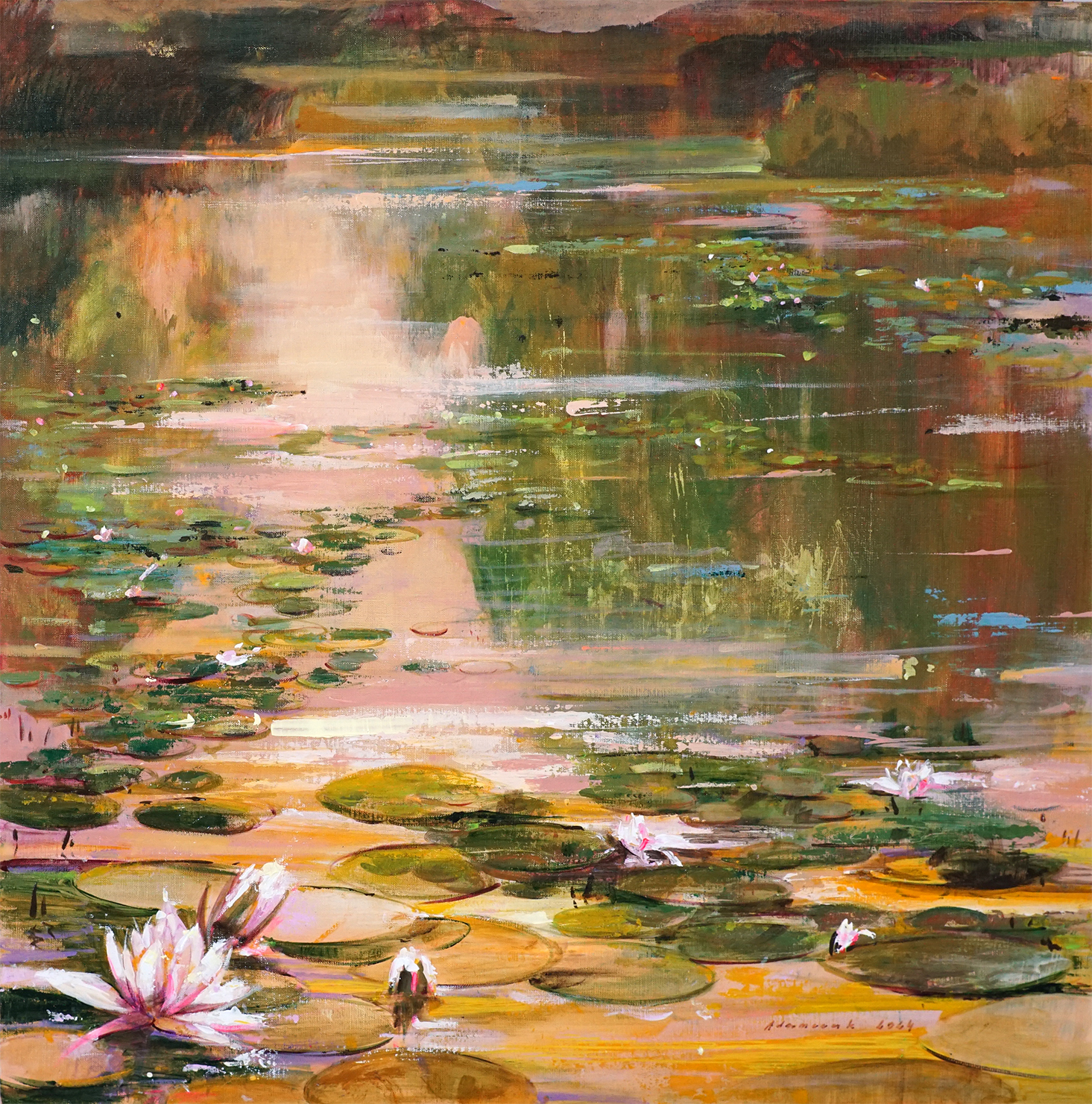 Obraz emanuje spokojem, przywodząc na myśl leniwy wieczór nad jeziorem. Kolory to prawdziwa uczta dla oka. Dominują zielenie, złoto i odcienie różu. Kompozycja jest harmonijna - lilie wodne unoszą się na tafli wody, którą rozdzielają refleksy światła. Wszystko rozmieszone jest w sposób, który przyciąga wzrok od dolnej krawędzi ku górze. Atmosfera tej sceny jest wręcz idylliczna. Można niemal poczuć lekką bryzę i usłyszeć szum wiatru. Artysta użył techniki impasto, co dodaje głębi i tekstury powierzchni. Pociągnięcia pędzla są swobodne, a farba miejscami mocno nałożona. Widać tu wpływ impresjonizmu - uchwycenie ulotnej chwili, grę światła i cienia. Obraz może wywoływać różne emocje. Na mnie sprawia on wrażenie nostalgicznej podróży do czasów dzieciństwa. Bliskości natury i beztroski. Mógłbym godzinami gapić się na ten widok. Moja siostra powiedziała: "To wygląda jak bajka!". Istotnie, obraz przenosi w inny world. I choć sztuka to subiektywne doświadczenie, trudno nie odnieść się do poczucia spokoju, które z niego bije. Jest to prawdziwy feast for the senses, który zaprasza do refleksji i kontemplacji nad pięknem otaczającego nas świata.