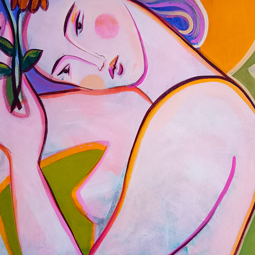 Obraz emanuje ciepłą, sentymentalną aurą. Na pierwszym planie widzimy postać kobiety delikatnie przytulającą żółty kwiat do twarzy. Zielone tło z subtelnymi motywami roślinnymi dopełnia harmonijną kompozycję. Kolory są żywe: soczysta zieleń, pomarańcze i fiolety tworzą intensywny kontrast, który przyciąga wzrok. Cieniowanie jest lekkie, nadając całości surrealistycznego charakteru. Styl artystyczny bliższy jest ekspresjonizmowi, gdzie kształty są uproszczone, a linie płynne. Artysta bawi się formą, co nadaje obrazowi nieco bajkowy, może nawet oniryczny nastrój. Takie "dreamy" wrażenie pozwala widzowi zanurzyć się w świecie wyobraźni. Dzieło wyraża spokój i delikatność, a jednocześnie może wywoływać nieco melancholijne refleksje. Może to jest chwila nostalgii? Zaduma nad ulotnością piękna? I coś w tym jest. Jak dla mnie, obraz przenosi odbiorcę w magiczny świat emocji, gdzie każdy detal ma swoje znaczenie. Głębia linii podkreśla subtelność gestu. To naprawdę zachwycająca praca, która może zainspirować do przemyśleń o harmonii natury i człowieka.