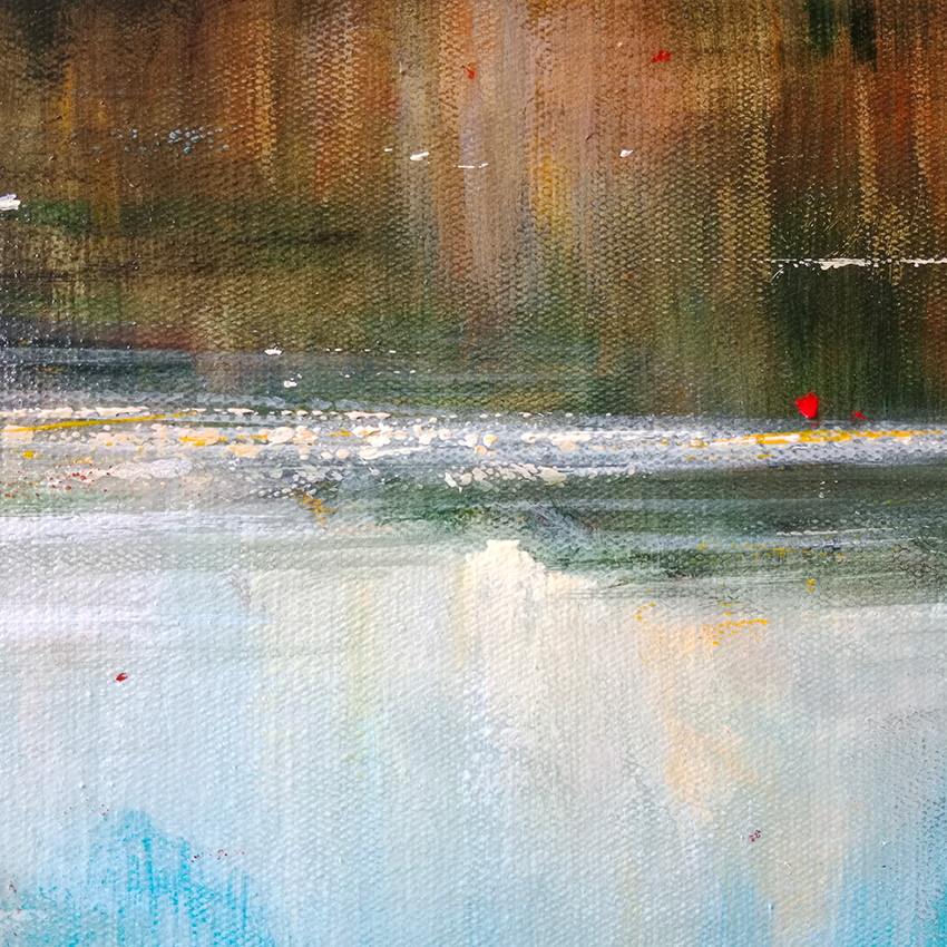 Na obrazie widzimy pejzaż, który urzeka swoją prostotą i naturalnym pięknem. Dominuje błękit nieba, zasnutego puszystymi białymi chmurami, które jakby ścigają się po nieboskłonie. Poniżej rozciąga się lustrzana tafla wody, odbijająca obraz nieba i otaczających ją drzew. Zieleń lasu miesza się z brązowymi akcentami, tworząc harmonijną kompozycję. Zupełnie jakby natura mówiła: "Patrz, jaki jestem piękny!". Atmosfera obrazu jest niezwykle spokojna, emanująca harmonią. Czuć słodką woń letniego popołudnia, kiedy to czas zwalnia, a my możemy zanurzyć się w kontemplacji. Artysta posługuje się techniką impastu, co dodaje głębi i tekstury. Pociągnięcia pędzla są zdecydowane, ale jednocześnie subtelne, jakby każdy z nich miał swoje miejsce i znaczenie. Obraz wywołuje uczucie spokoju i zadumy nad pięknem otaczającego nas świata. Dzięki temu możemy poczuć się, jakbyśmy sami tam byli. Dzień nad jeziorem, taki magiczny, że aż trudno oderwać wzrok. Wyjątkowy "reflex" wody wprowadza dodatkowy wymiar refleksji – dosłownie i w przenośni. To jeden z tych widoków, który pamięta się na zawsze.