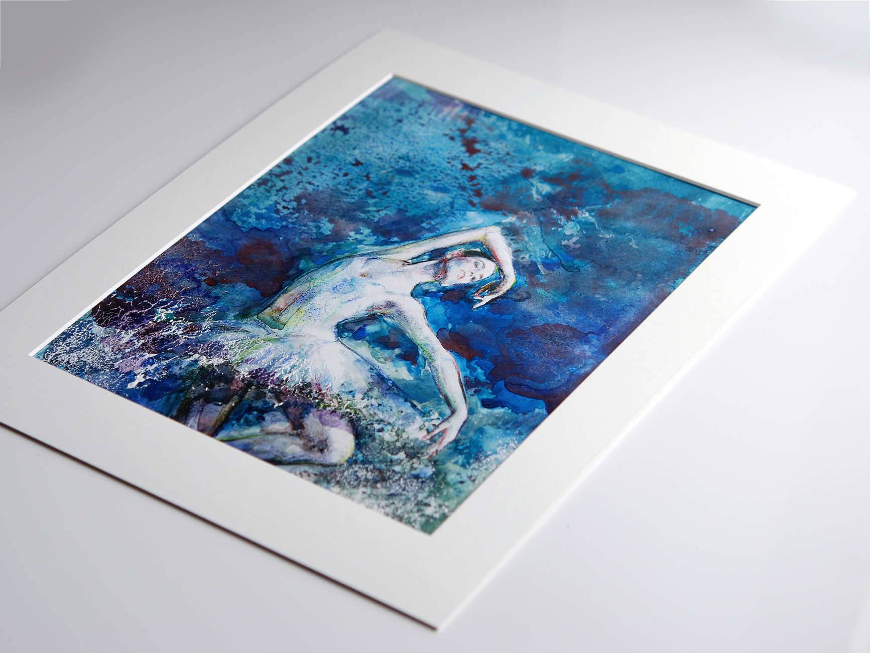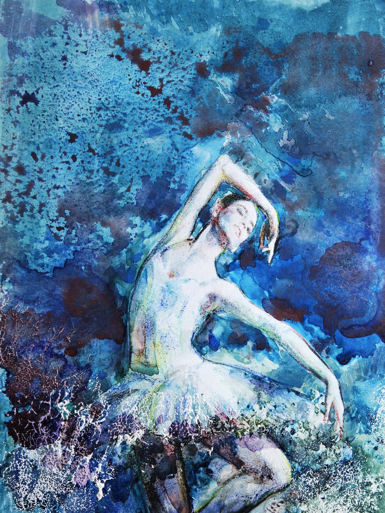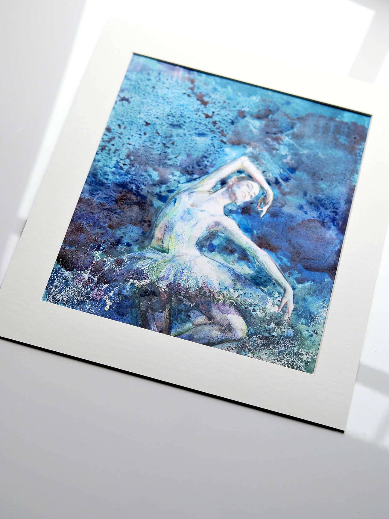 Praca inspirowana światem tancerek. Technika mieszana + passepartout. Passepartout służy jako dekoracja i oddziela obraz od szkła. Standardowy rozmiar, łatwy do oprawienia (proszę kupić ramę np. na zdjęcia: 30 x 40 cm) Ten obraz dostarczany jest bez ramy, dołączone jest białe passepartout. Rodzaj papieru: karton 300 g/m² Połączenie różnych technik: akwarele, gwasze, kredki. Obraz werniksowany werniksem matowym w celu ochrony koloru.