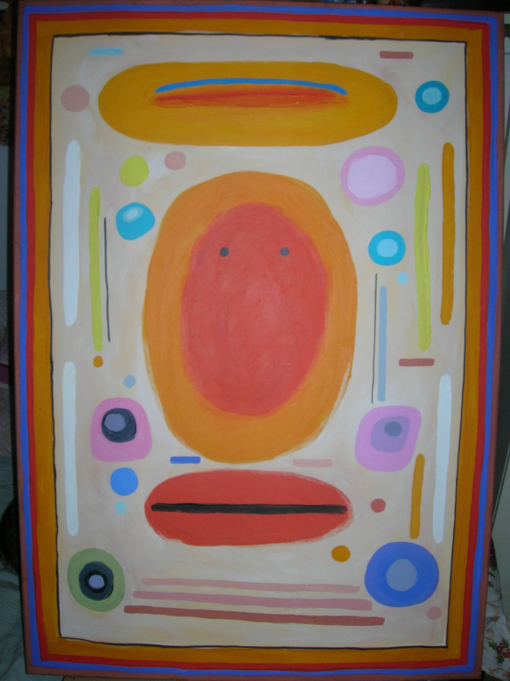 Ten obraz to prawdziwa eksplozja kolorów i kształtów, które tańczą wspólnie w harmonii. Dominują tu ciepłe odcienie pomarańczowego i żółtego, które przeplatają się z delikatniejszymi pastelowymi różami i błękitami. Centralna, owalna forma przyciąga wzrok jak magnes, otoczona mniejszymi kołami i liniami. To trochę jak układanka, w której każdy element ma swoje miejsce. Atmosfera jest pełna beztroski i radości, przypomina letni dzień na łące pełnej kwiatów i śmiechu dzieciaków. Styl obrazu można określić jako abstrakcyjny, z nutą minimalizmu. Artysta umiejętnie bawi się prostymi formami i jasnymi kolorami, co sprawia, że obraz jest jak „happy place” zamknięte w ramach. Interpretacje? Odbiorca może poczuć przypływ optymizmu, może nawet nostalgii za czasami dzieciństwa. Technika używana przez malarza to prawdopodobnie akryl, co dodaje intensywności barwom. Patrzę na to i myślę, jak cudownie byłoby zanurzyć się w tym świecie - zupełnie jak w bajce, gdzie wszystko jest prostsze. A co ty widzisz? Może jakieś emocje, które kołaczą się w sercu? A seven-year-old might say: te kółka wyglądają jak baloniki na urodzinowym przyjęciu. Ten obraz emanuje feel-good wibracjami, które mogą rozweselić nawet najbardziej pochmurny dzień. Świetny przykład, jak sztuka może być pełna życia i emocji.