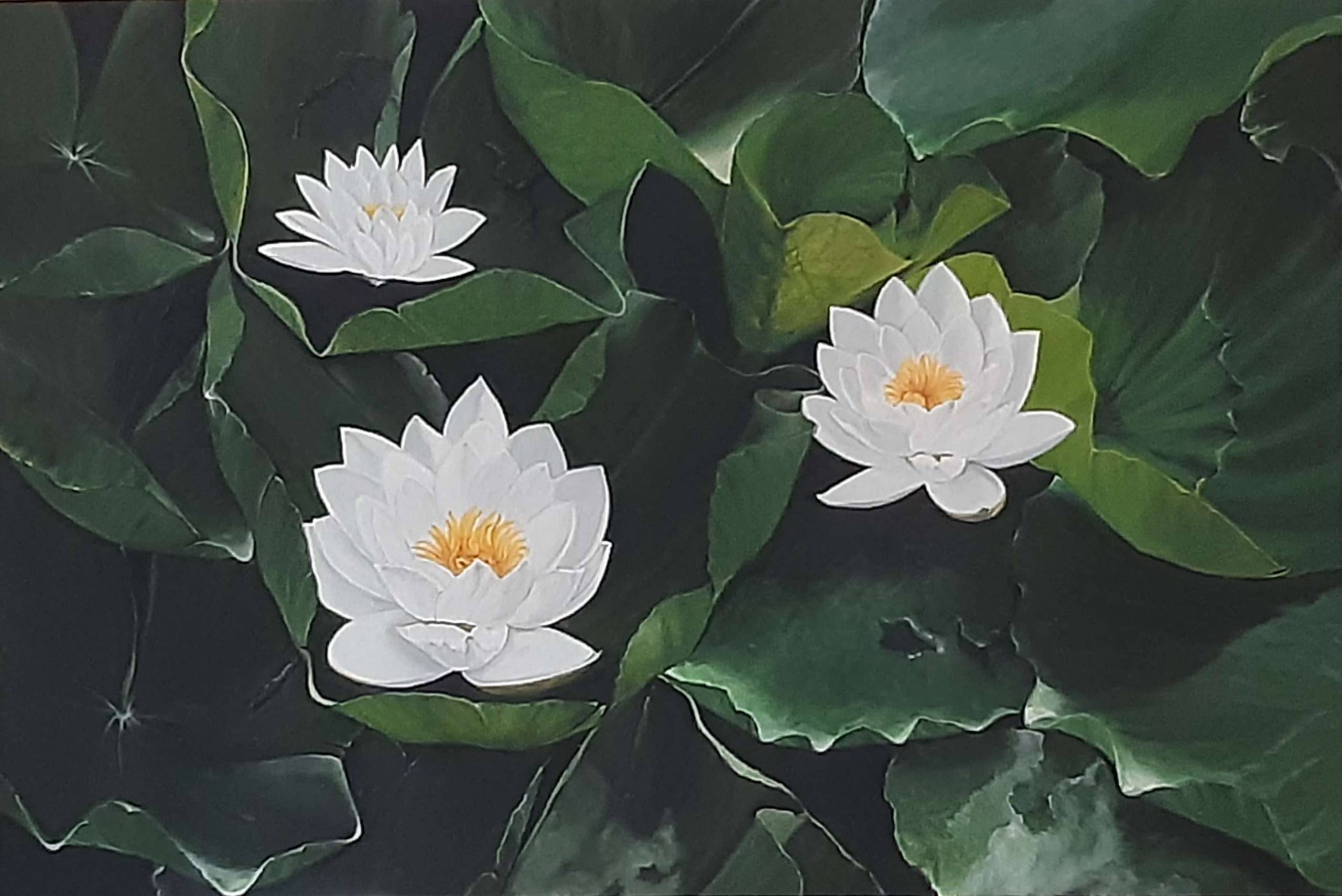 Obraz na pierwszy rzut oka wciąga swoją spokojną kompozycją trzech białych lilii wodnych unoszących się na ciemnozielonych liściach. Kolory są stonowane, a kontrast między bielą kwiatów a głęboką zielenią liści tworzy niemal magiczny efekt spokoju i relaksu. Rozłożone w równomierny sposób kwiaty sprawiają wrażenie, jakby tanieczyły na tafli wody. Atmosfera tego dzieła to serenity, z domieszką tajemniczości. Delikatne pociągnięcia pędzla i subtelne cieniowanie zdradzają talent artysty do oddawania naturalnego piękna przyrody. Każdy płatek lilii wydaje się niemal w dotyku, a liście z kusząco realistyczną fakturą. Obraz może wywoływać różnorodne emocje. Dla niektórych jest to uczucie wyciszającego azylu, dla innych melancholii. Patrząc na niego, można poczuć się jak dziecko wrzucające kamyki do wody. "Lilie są takie piękne!” – mogłoby powiedzieć 7-letnie dziecko patrząc na ten magiczny widok. Styl artysty zdaje się czerpać z natury, używając realistycznych technik malarskich, które hipnotyzują i przyciągają spojrzenia. To jedno z tych dzieł, które można oglądać godzinami, chłonąc spokój i czerpiąc z niego inspirację. Kto by pomyślał, że tak prosty obraz może budzić tyle refleksji i odczuć!