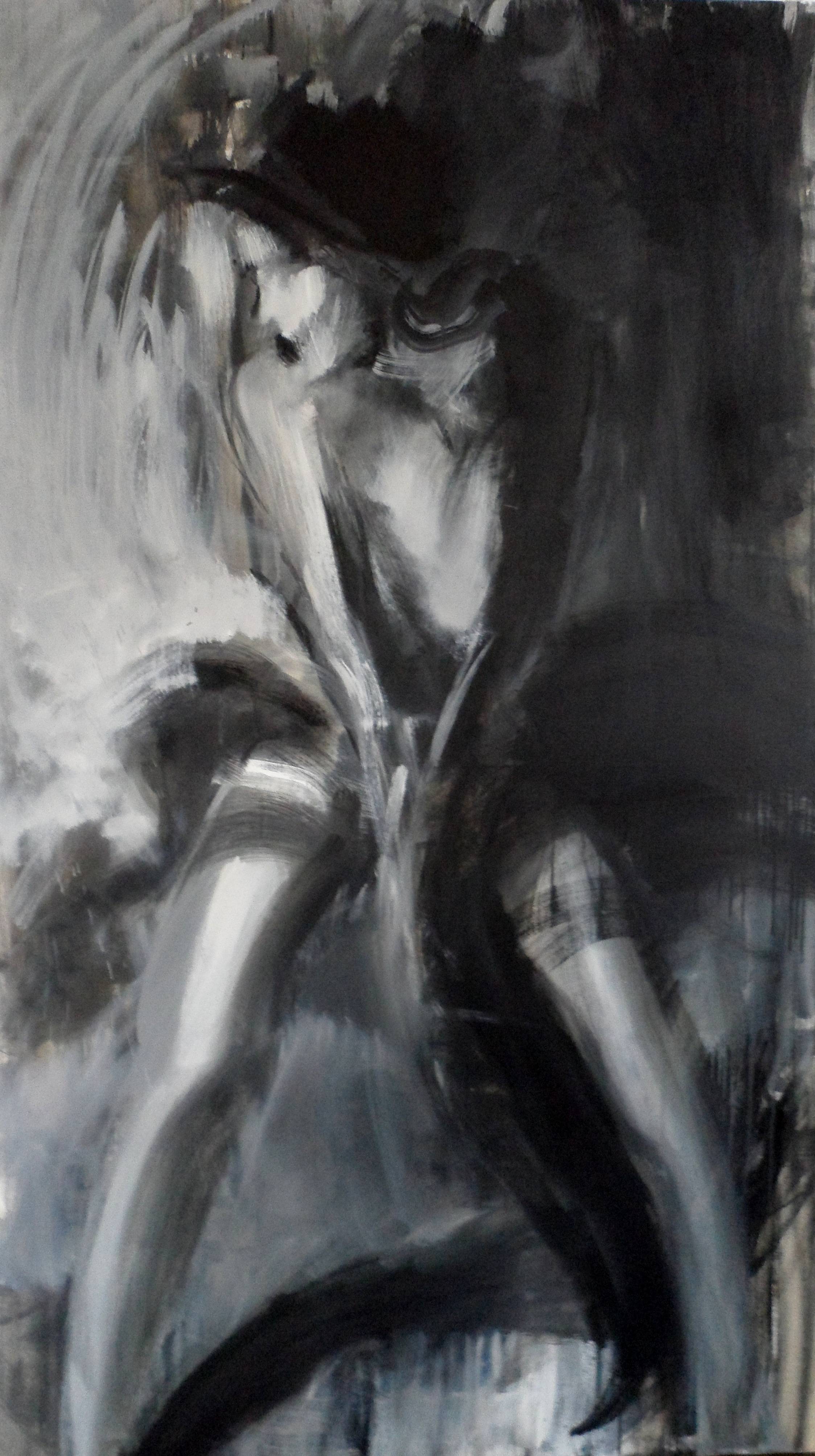 Obraz emanuje niezwykłą tajemniczością i głębią. Dominują na nim odcienie szarości, czerni i bieli, co nadaje mu monochromatyczny charakter. Rozmyte, abstrakcyjne linie i kształty tworzą wrażenie ruchu i dynamiki. Centralna postać jest ledwie uchwytna, jakby pulsowała energią i emocjami. Całość kompozycji wydaje się być zamglona, jakby ukrywała jakaś ukryte przesłanie. Nastrój jest raczej melancholijny, ale też pełen napięcia. Obraz stwarza wrażenie, jakby chciał opowiedzieć historię, która wymaga odkrycia, ale zawiera w sobie nutę niepokoju. Styl jest ekspresyjny, z wyraźnymi pociągnięciami pędzla. Artysta korzysta z techniki impasto, co dodaje dziełu surowości i trójwymiarowości. Emocje, jakie może wzbudzić to dzieło, oscylują między zachwytem a dezorientacją. Jest coś hipnotyzującego w sposobie, w jaki kompozycja zdaje się poruszać przed oczami oglądającego. Czuć tu tęsknotę i niepewność. Jakby ktoś mówił: "Look closer". Moja siostra powiedziała, że to wygląda jak smutny deszczowy dzień. Obraz przypomina mi, że czasem najpiękniejsze jest to, co ukryte. To jak z zagadką, którą chcemy rozwikłać. Fascynujący.