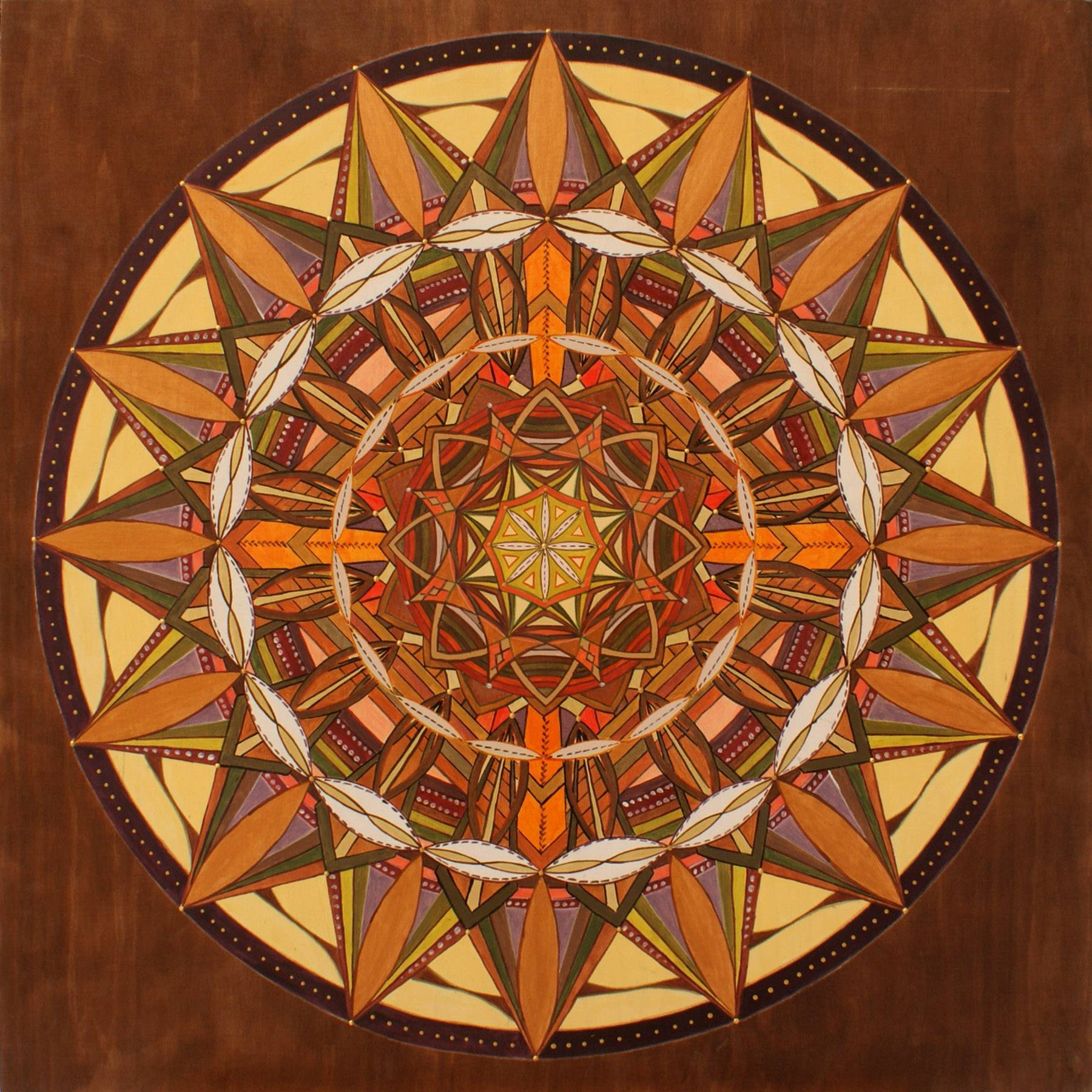 Ten obraz to prawdziwa feeria barw i kształtów, w której dominuje ciepło pomarańczy, głęboka zieleń i złamany odcień brązu. Centralnym elementem jest mandala, symetryczna i harmonijna, delikatnie rozchodząca się niczym kręgi na wodzie. Każdy trójkąt, linia i zakrzywienie wydają się opowiadać jakąś historię, zanurzoną w spirytualnej energii. Atmosfera jest niezwykle spokojna, wręcz medytacyjna, jakby obraz mruczał cichą mantrę. Styl artystyczny jest inspirowany techniką geometrycznej abstrakcji, przypomina folkowe wzory, ale w nowoczesnym twist. Artysta stworzył iluzję trójwymiarowości przy pomocy precyzyjnych linii, co dodaje dziełu pewną "depth", jak to mówią Anglicy. Można poczuć się zagubionym, ale jednocześnie zaskakująco odnalezionym w tej kompozycji. To może być magiczne koło do podróży w czasie myślach. Może wywołać uczucie spokoju, ale też tajemniczość, jak skrzyżowanie dwóch ścieżek w nieznanej krainie. Dla mnie, ten obraz jest jak marzenie o przygodzie, gdzie każde spojrzenie odkrywa coś nowego. "Wow, takie coś fragmenty!" mogłoby powiedzieć dziecko, odkrywając detale. Sztuka bywa jak puzzle - im dłużej patrzysz, tym więcej odkrywasz.