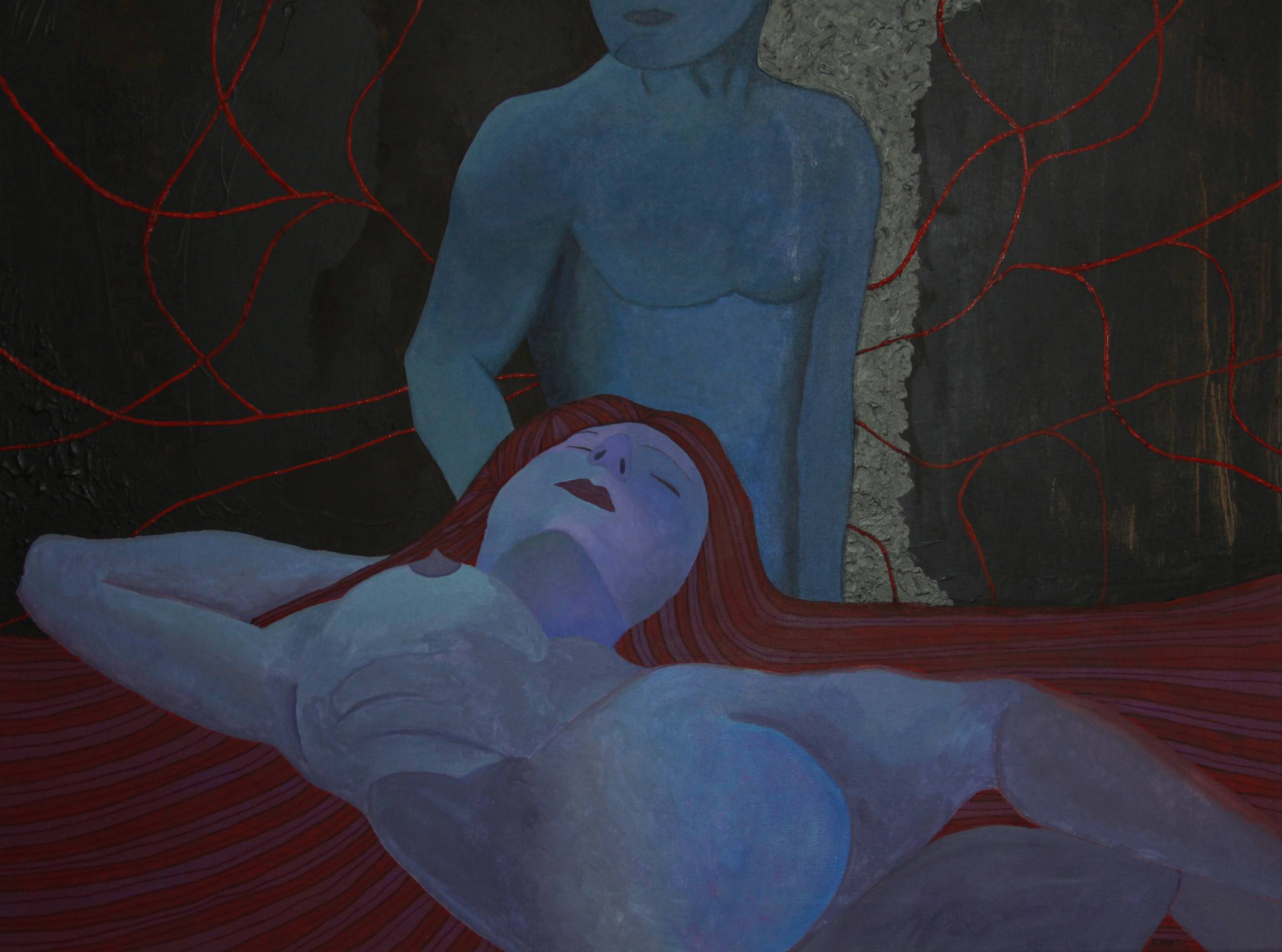 Na obrazie dominują ciemne, głębokie odcienie niebieskiego i czerwonego, które tworzą intensywną, niemal magiczną atmosferę. Postacie są namalowane z miękkimi, zaokrąglonymi kształtami, co nadaje im pewną tajemniczość. To tak, jakby były wyciągnięte z innej rzeczywistości. Kompozycja jest prosta, lecz sugestywna, przyciągająca wzrok na centralną postać. Na pierwszy rzut oka czujesz calm i spokój, a jednocześnie coś nieuchwytnego, co przyciąga uwagę. Styl artystyczny jest abstrakcyjny, z wyraźnymi wpływami surrealizmu. Linia i kolor odgrywają kluczową rolę, tworząc dynamiczne kontrasty. Artysta zręcznie posługuje się nimi, aby kreować emocje i wyrażać głębokie pragnienia. Obraz jest jak zagadka, którą chcesz rozwiązać, choć może nigdy się to nie udać. Postacie wyglądają, jakby były zanurzone w płynnej rzeczywistości między snem i jawą. Moja siostra powiedziałaby: "To wygląda jak sen!" I pewnie miałaby rację. Obraz może wywoływać uczucia nostalgii za czymś nieodgadnionym, nieosiągalnym. Emocje zdają się mieszać, tworząc kalejdoskop wrażeń w odbiorcy. Patrząc na to dzieło, czuję pewną ciekawość i zachwyt, jakbym próbował dotknąć tajemnicy ukrytej w niebieskich tonach.