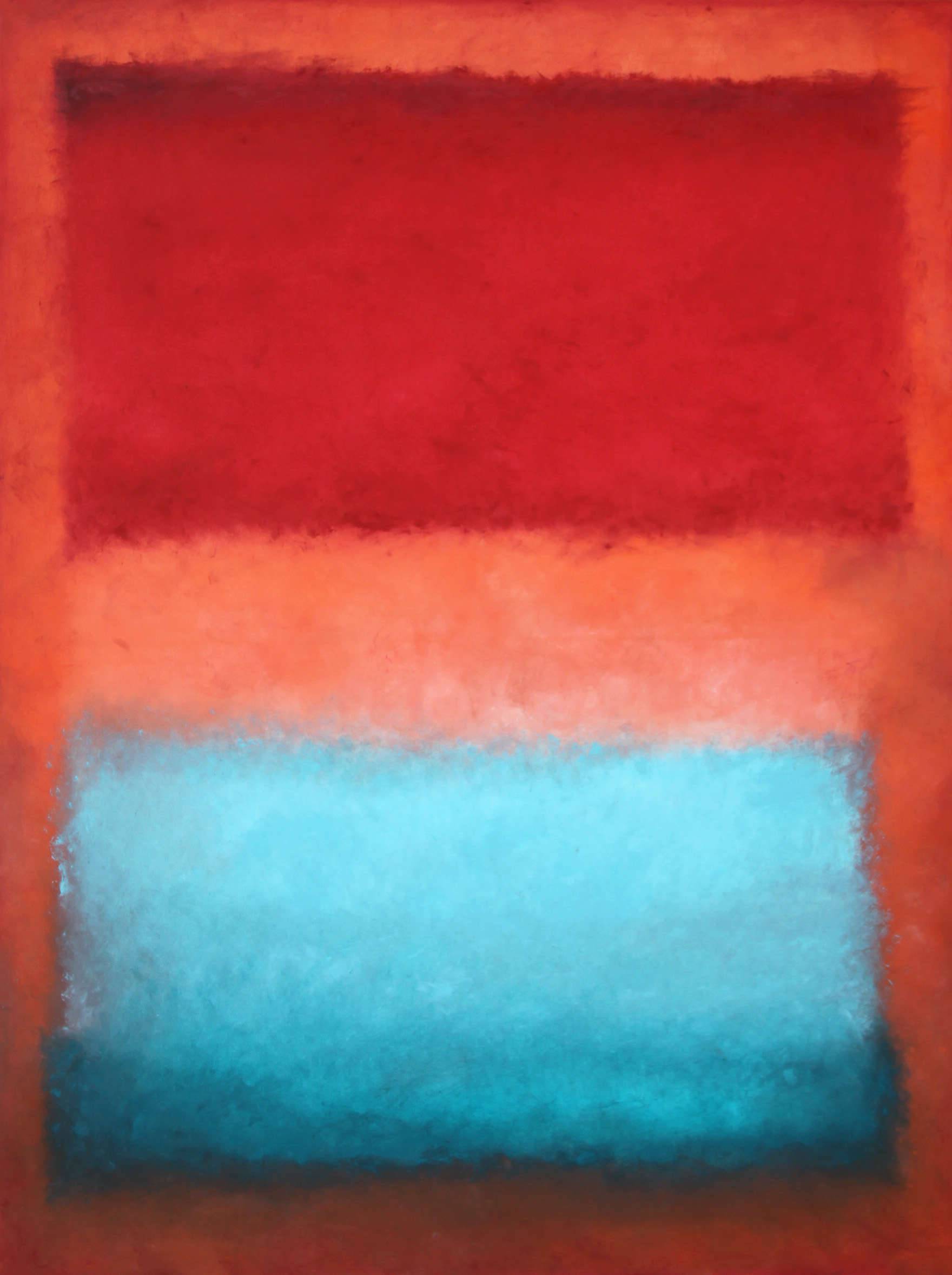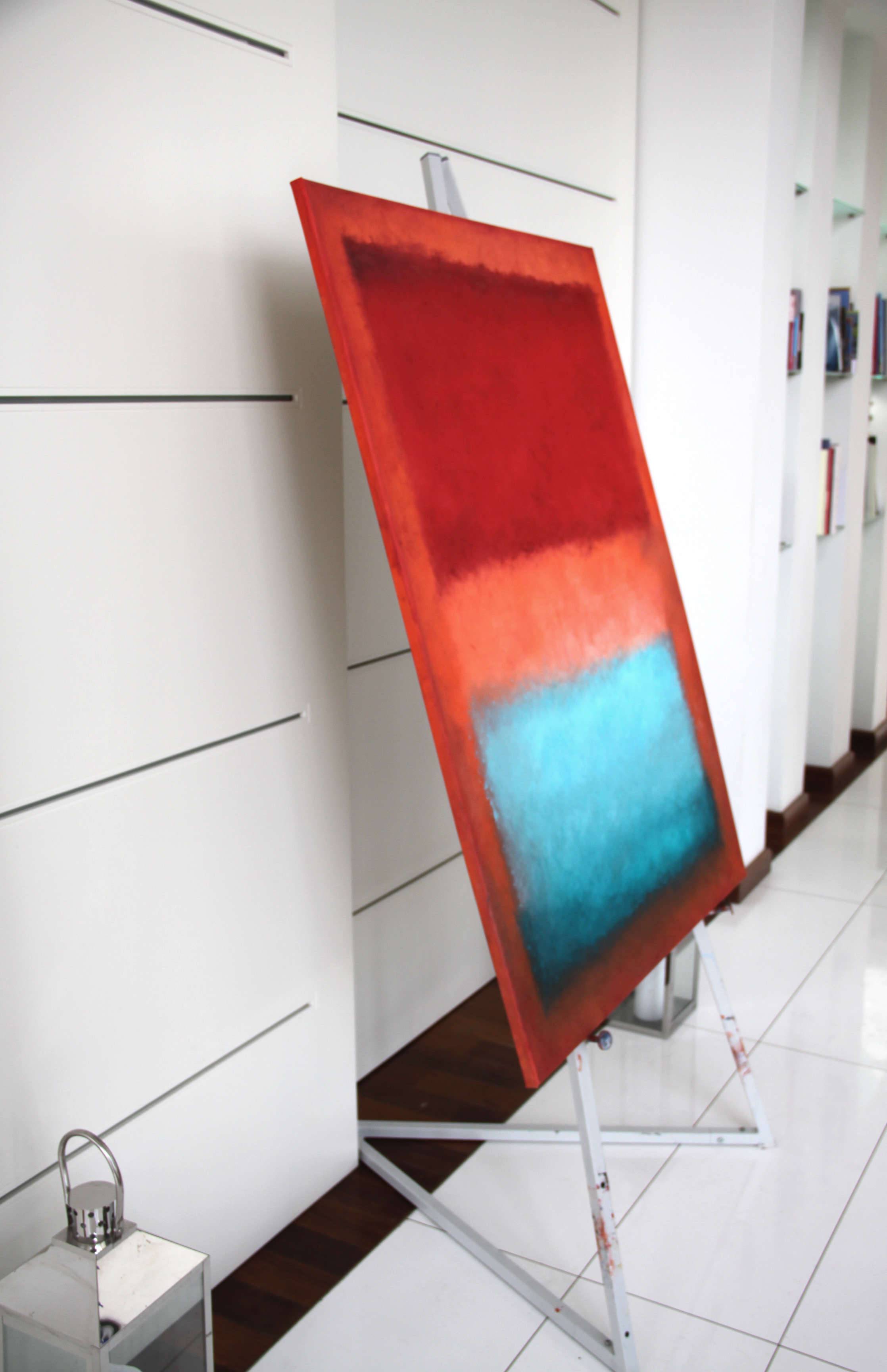 Obraz emanuje intensywnymi kolorami, które niemalże krzyczą z płótna. Dwa prostokąty – górny w ciepłych, czerwonych barwach, dolny w chłodnym błękicie – zdają się dryfować na tle delikatniejszego pomarańczu. Kompozycja to prawdziwe clash of titans, gdzie kolory zderzają się, tworząc dynamiczne napięcie. Artysta zastosował technikę rozmycia, dodając dziełu miękkości i tajemniczej auray. Atmosfera obrazu jest kontemplacyjna, skłaniająca do zatrzymania się i zanurzenia w głębi kolorów. Ciepłe odcienie przywołują uczucie spokoju, podczas gdy chłodne tony mogą budzić refleksję. Malowidło w stylu abstrakcyjnego ekspresjonizmu angażuje widza nie tylko wizualnie, ale i emocjonalnie. Czuję się, jakbym patrzył przez okno w inny świat. Dziecko mogłoby powiedzieć: „To wygląda jak wielka czerwona flaga na niebie!” Może to wyrażać zarówno beztroskę, jak i fascynację prostotą formy. Obraz przyciąga uwagę, zmuszając odbiorcę do własnej interpretacji. Wciąga mnie, jakby zapraszając do odkrycia sekretów ukrytych w jego barwach.