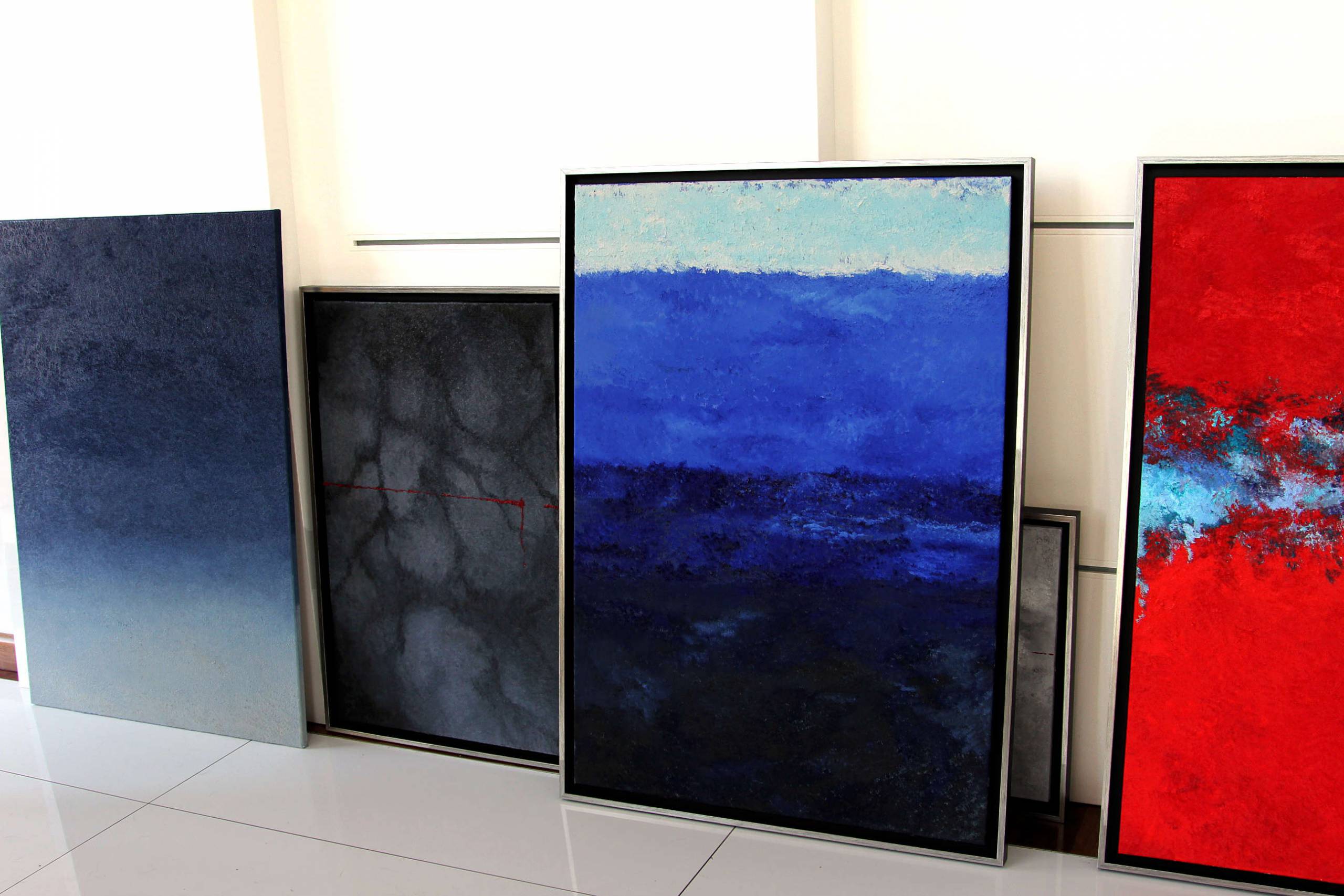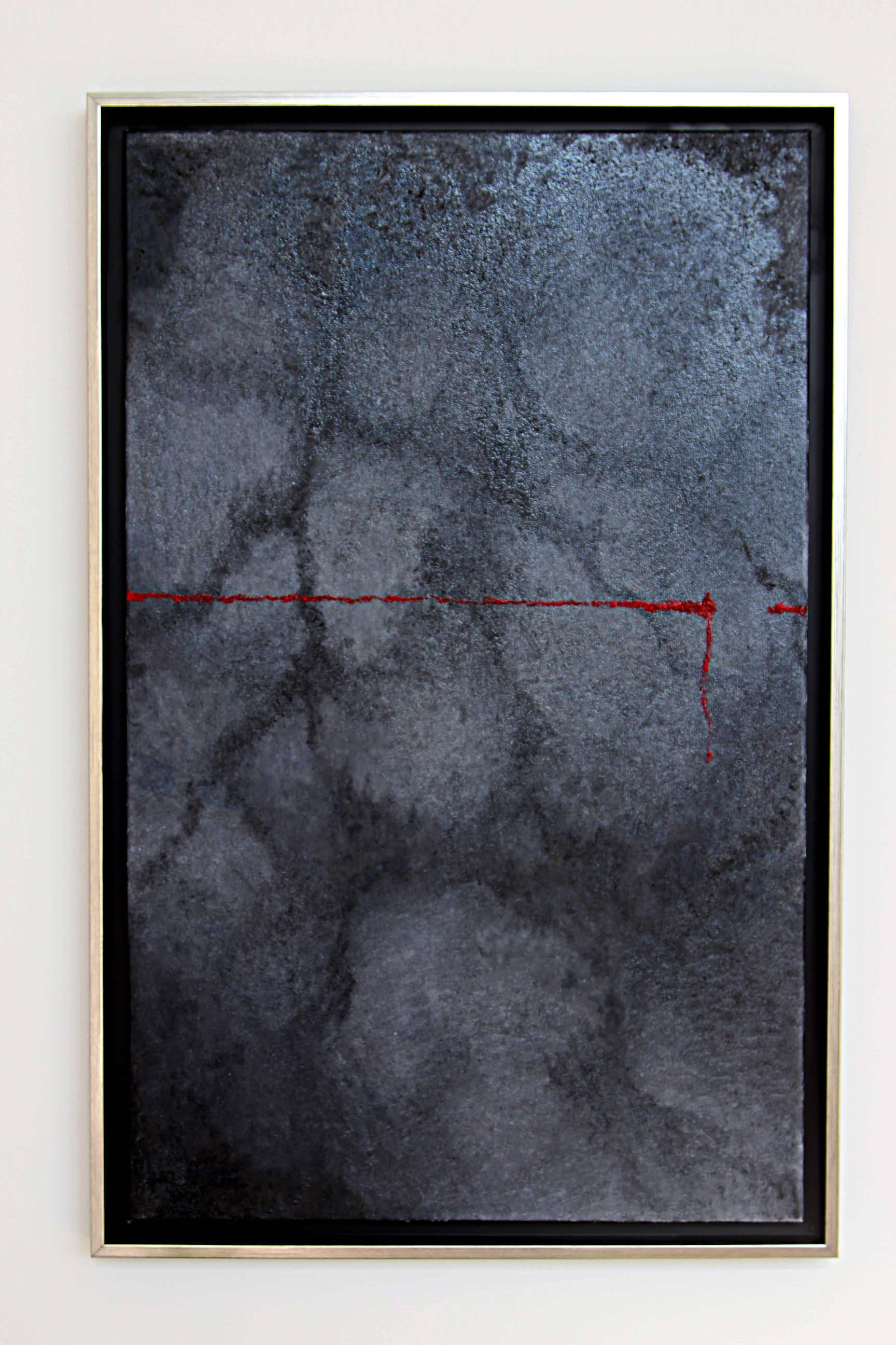 Na obrazie dominuje ciemnoszara tekstura, przypominająca chmury lub nierówną powierzchnię skał. Niebo jest ponure, niemal tajemnicze, wciągając widza w swój głęboki, mroczny świat. Na tle tej głębi pojawia się cienka, czerwona linia, przecinająca obraz w poprzek jak smuga krwi. Taki kontrast przyciąga uwagę, a zarazem dodaje dramatyzmu. Klimat dzieła jest ciężki, niepokojący, jakby coś wisiało w powietrzu. Artysta użył tu minimalistycznych technik, skupiając się na fakturze i kolorze. A może to deszcz i słońce jednocześnie? Użycie czerwonego wprowadza element chaosu, jakby coś ledwo ukrytego miało za chwilę wypłynąć na powierzchnię. Z jednej strony ta krwista linia może być ironiczna, z drugiej strony... może sygnalizować rozdarcie. Patrząc na to dzieło, można poczuć niepokój i zastanawiam się, co jest tuż "behind" tej warstwy terenu. "Czerwony to kolor mojej ulubionej zabawki" - powiedziałoby dziecko. Ikonograficzna prostota pracy pozwala na interpretację na wielu poziomach, a sama kompozycja skłania do długich refleksji.