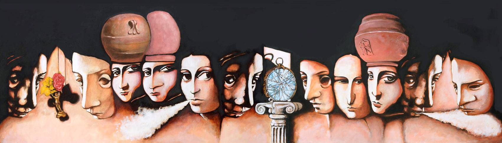 Obraz przedstawia szereg twarzy splecionych w surrealistycznym tańcu, z zaskakującą mieszanką kolorów i kształtów. Dominują odcienie brązu, różu i bieli, które tworzą tajemniczą i enigmatyczną atmosferę. Twarze są nakładające się, co dodaje kompozycji dynamizmu i pewnej dozy chaosu. W centrum uwagi znajduje się kolumna z zegarem, który, choć pęknięty, emanuje sensem przemijającego czasu. Całość tkwi w pewnej zawieszeniu, co budzi uczucie niepokoju, ale i fascynacji. Widz podświadomie zaczyna zastanawiać się, co te postacie myślą, co czują. Technika malarska użyta przez artystę jest pełna finezji. Wyraziste kontury i mocne cienie nadają pracy stylu, który jest zarówno klasyczny, jak i nowoczesny. Sypie się tu, powiedzmy, "artistic chaos", jakby artysta świadomie igrał z percepcją naszego świata. Patrząc na to, można odnieść wrażenie, że jest to nie tyle scena z rzeczywistości, co raczej z jakiegoś snu czy fantazji. Zastanawiam się, czy każdy z nas nie staje czasem przed podobnym lustrem, pełnym odbić i myśli. Wywołuje to emocje, wahające się od zaintrygowania po niepokój. Małe dziecko mogłoby powiedzieć: "Te twarzyki są jak z bajki!" W swojej formie obraz jest nieco abstrakcyjny, a jednak porusza. Jest w nim coś, co nie pozwala odejść bez refleksji. Czy to nostalgia? Może odrobina strachu przed przemijającym czasem. Każdy znajdzie tu coś dla siebie, coś, co wbije się w pamięć.
