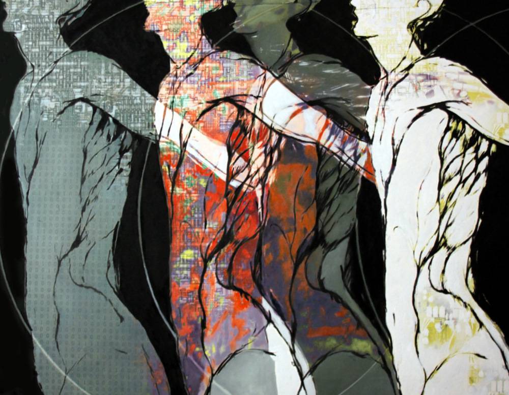Obraz prezentuje sylwetki postaci przesuwających się niczym duchy przez przestrzeń, tworząc efekt rozmycia i iluzji ruchu. Dominują ciemne, kontrastujące kolory, takie jak czerń, szarość i biel, które splatają się z intensywnymi plamami czerwieni i pomarańczu. Kompozycja zdaje się być dynamiczna. Kształty są smukłe i eleganckie, unosząc się jak mgła w porannym lesie. Atmosfera dzieła jest tajemnicza, może nawet lekko niepokojąca. Można poczuć zawiesiny emocji, jakby coś miało się zaraz wydarzyć. Styl artysty łączy ekspresję z pewną abstrakcją, dając przestrzeń do interpretacji. Linie są odważne, jakby ryte z pewnością i zapałem. Patrząc na obraz, można odczuć melancholię i zawirowanie uczuć. Może chodzi o przemijanie? Albo odnajdywanie siebie w chaosie? I can't say for sure. Technika zastosowana przez artystę, przypomina szkic, gdzie niedopowiedzenia stanowią klucz do zrozumienia. Dla mnie to obraz, który mówi o ulotności chwili. I jakby mówił „żyj teraz”. Nostalgia miesza się tu z melancholią, tworząc ciekawą mieszankę emocji. Widząc to, przywodzi na myśl pytanie — dokąd zmierzamy? A może po prostu cieszymy się podróżą? W końcu, dla dziecka, te postacie mogą być superbohaterami, którzy odlatują na misję w nieznane. Obraz zachęca do refleksji, pozostawiając widza z wieloma pytańiami.