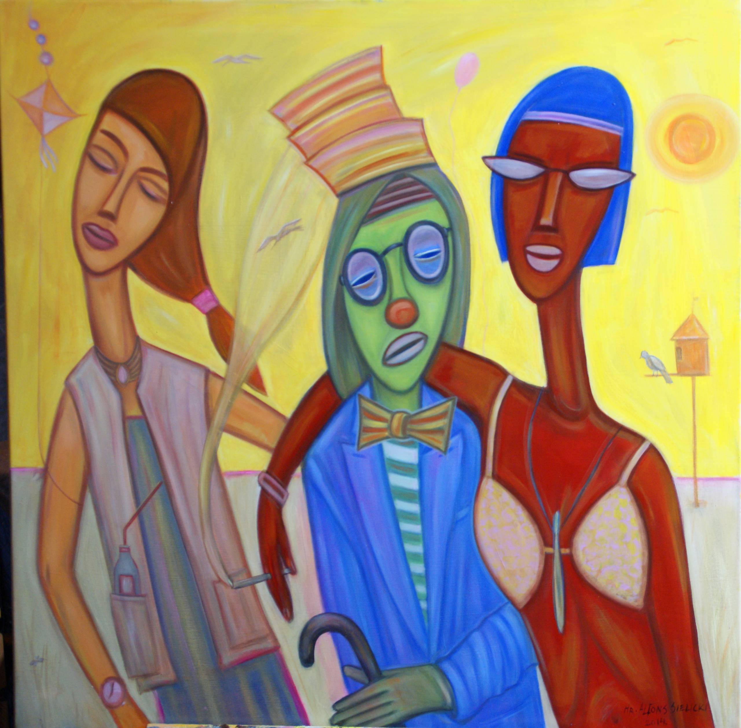Na obrazie widzimy trzy postacie wyrażające różnorodne emocje. Uderzające, żywe kolory – zielony, niebieski, pomarańczowy – tworzą dynamiczną kompozycję i przyciągają wzrok. Środkowa postać z zieloną twarzą i kapeluszem wygląda niczym klaun zagubiony w codzienności. Po jej prawej stronie, brunetka ma na sobie czerwoną bluzkę, jej szeroki uśmiech kontrastuje z zasłoniętymi oczami, co dodaje tajemniczości. Z kolei blondynka lekko przymknięła oczy, jakby bujała w obłokach. Tło w ciepłych żółciach sprawia, że scena emanuje letnim, beztroskim klimatem. Jest takie joy, które czuć w powietrzu. Artysta zastosował technikę uproszczonych kształtów, które przypominają nieco twórczość kubistów. Linie są miękkie, a całość wydaje się płynna i delikatna. Może ktoś poczuje radość, patrząc na te postacie, może ktoś zastanowi się nad ich historią. To surrealistyczne połączenie pozwala na dowolną interpretację. A ja? Pomimo lekkiego absurdum, czuję po prostu spokój. Jak artysta to robi? Jakimś sposobem sprawia, że obraz wydaje się jednocześnie zabawny i głęboki. Postacie stoją razem, a może to po prostu przyjaźń bez słów. Kolorowe marzenie, które prowadzi nas do refleksji nad codziennością. Krótko mówiąć, obraz jest po prostu ekstra.