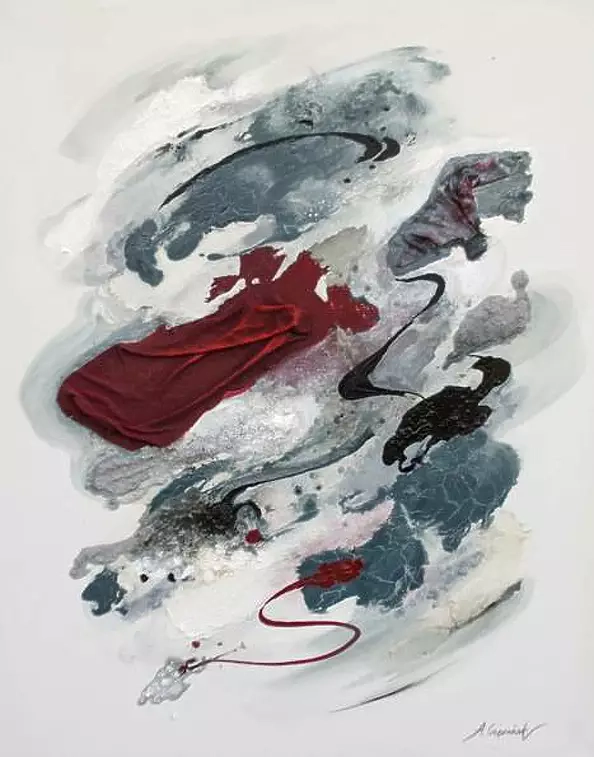 Obraz jest prawdziwym widowiskiem kolorów i form. Dominują szarości, biele i czernie z akcentem głębokiej czerwieni, która przyciąga wzrok jak magnes. Kompozycja jest dynamiczna, chaotyczna, ale w sposób przemyślany. Na pierwszy rzut oka widać plamy i smugi o różnej intensywności, tworzące wrażenie ruchu i zmiany. Całość sprawia wrażenie abstrakcyjnej burzy - nieco groźnej, ale fascynującej. Atmosfera obrazu jest mieszanką spokoju z nutką tajemniczości. Elegancja barw i ich rozmieszczenie emanuje spokojem, jednak ich ciemne odcienie i dynamiczne linie wprowadzają element niepokoju, jakby coś miało zaraz się wydarzyć. To jakby cisza przed burzą. Styl artysty zdaje się być abstrakcyjny, z wyraźnym naciskiem na teksturę i gesty malarskie. Techniką zdaje się być akryl albo olej, które umożliwiły uzyskanie tak złożonego efektu strukturalnego. Plamy czerwieni dodają charakteru i ryzyka do neutralnej palety. Obraz wywołuje w widzu różne emocje. Może zastanawiać, intrygować albo nawet trochę przerażać. Te smugi i kolory układają się w coś, co każdy może interpretować inaczej. Ja widzę w tym chaosie pewną formę piękna. Oh, and that splash of red? It’s electrifying. Dziecko mogłoby powiedzieć: "To wygląda jak czerwony smok lecący w chmurach!". Obrazy takie jak ten skłaniają do refleksji nad dynamiką życia, jego chaosem i ulotnym pięknem ukrytym wśród codzienności. Czyż to nie niesamowite, jak sztuka potrafi wpływać na nasze emocje?