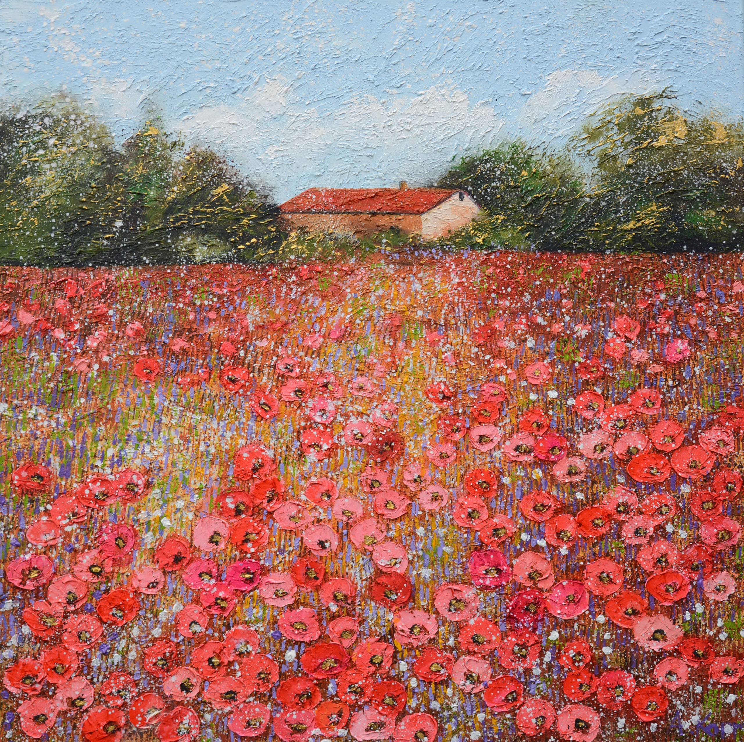 Na obrazie widać malownicze pole maków, rozlegające się aż po horyzont. Dominują intensywne czerwienie i różowe odcienie kwiatów, które kontrastują z zieloną trawą. W oddali stoi domek z czerwoną dachówką, otoczony ciemną zielenią drzew, tworząc cichy, idylliczny krajobraz. Niebo jest niebieskie, gładkie, miejscami ozdobione delikatnymi chmurami. Atmosfera obrazu emanuje spokojem i lekkością. Przywodzi na myśl letnie dni spędzane na wsi, pełne beztroski i błogiego relaksu. Jest w tym coś ciepłego i nostalgicznego, co przyciąga wzrok i serce. Technika użyta przez artystę to impasto - grube warstwy farby dodają obrazu tekstury, sprawiając, że kwiaty niemal wychodzą z płótna. Obraz wywołuje w widzu uczucie radości i wolności. Można poczuć lekki letni powiew na twarzy. 7-letnie dziecko powiedziałoby: "Maki wyglądają jak czerwone chmurki na ziemi!". Jest coś urzekającego w tej prostocie i kolorach natury. W stylu artysty widać lekkość i zabawę z kolorem. Kompozycja jest well-balanced, pozwalając oczom płynąć po przestrzeni bez pośpiechu. Moja pierwsza reakcja? Chciałbym tam być - uciec od miejskiego zgiełku i zatracić się w tym makowym morzu. Idealne miejsce na chwilę zadumy i odpoczynku.