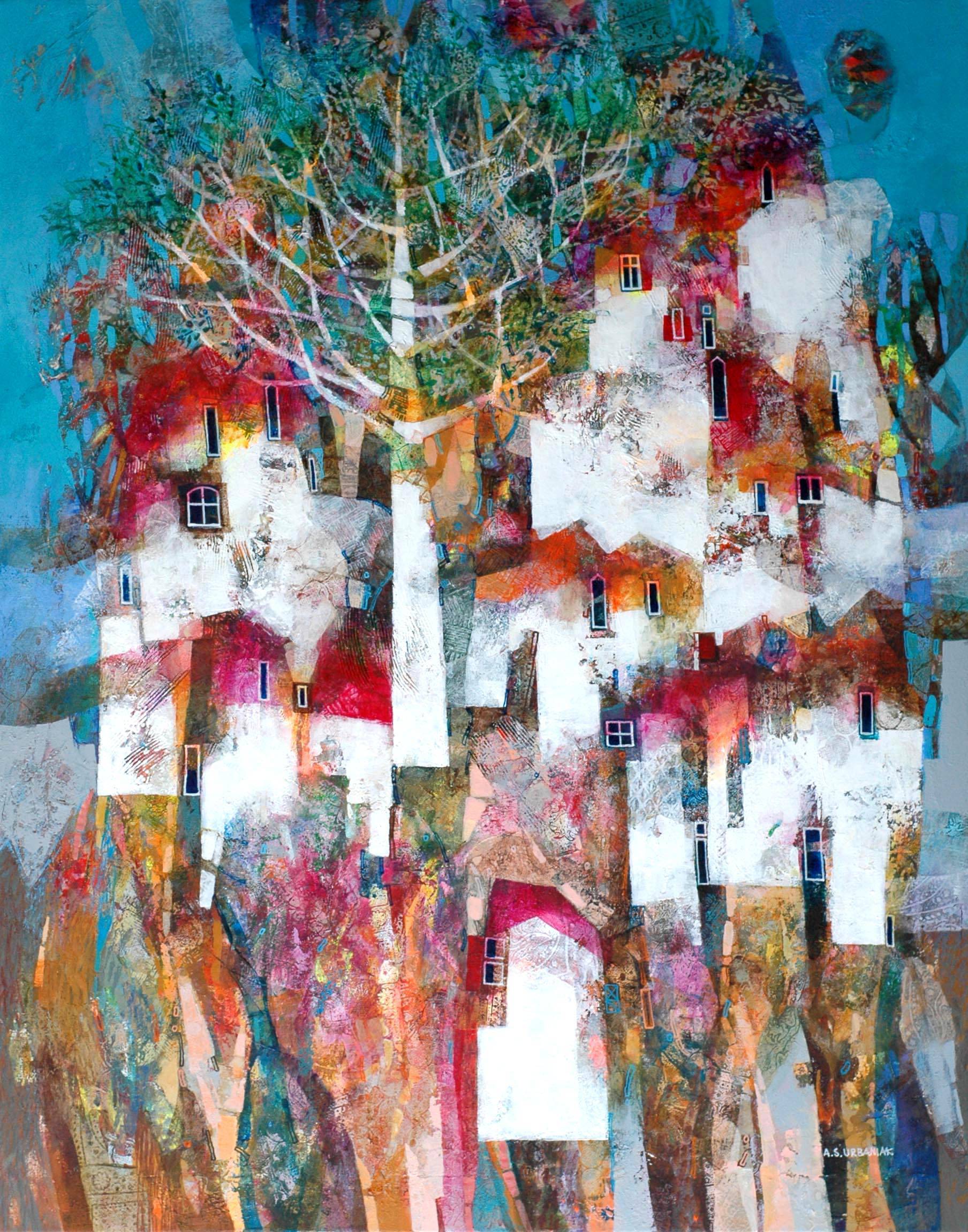 Obraz emanuje feerią kolorów, gdzie biel, czerwień i niebieski tworzą energetyczną mieszankę. W pierwszym planie widać białe domki, prawie bajkowe, które wyrastają jak pąki kwiatów z kolorowego tła. Kompozycja obrazu jest dynamiczna, a wręcz tętniąca życiem. Można powiedzieć, że artysta użył techniki kolażu, łącząc intensywne barwy z delikatnymi wzorami. Atmosfera jest pełna magii i tajemnicy, co sprawia, że odbiorca czuje się jak w baśniowej krainie. Obraz wywołuje uczucie ciepła i radości, jakby chciał powiedzieć: "witaj w świecie kolorów!". Patrząc na ten obraz, można się całkiem zatracić w jego detalach. Jest taki... dreamlike. Tak mi się marzy tam być i chodzić po tych tajemniczych uliczkach. Styl artysty jest bardzo ekspresyjny, pełen dynamiki i spontaniczności. Wydaje się, że każdy pociągnięcie pędzlem jest przemyślane, a jednak pełne wolności. To obraz, który przypomina dziecięcy sen, pełen nieskończonych możliwości. "To jest drzewo i domki!", powiedziałby pewnie malec, wskazując palcem na płótno. Można na nim dostrzec emocje radości, ale i nutę nostalgii, jakbyśmy oglądali wspomnienie przeszłości, które zawsze jest blisko nas.