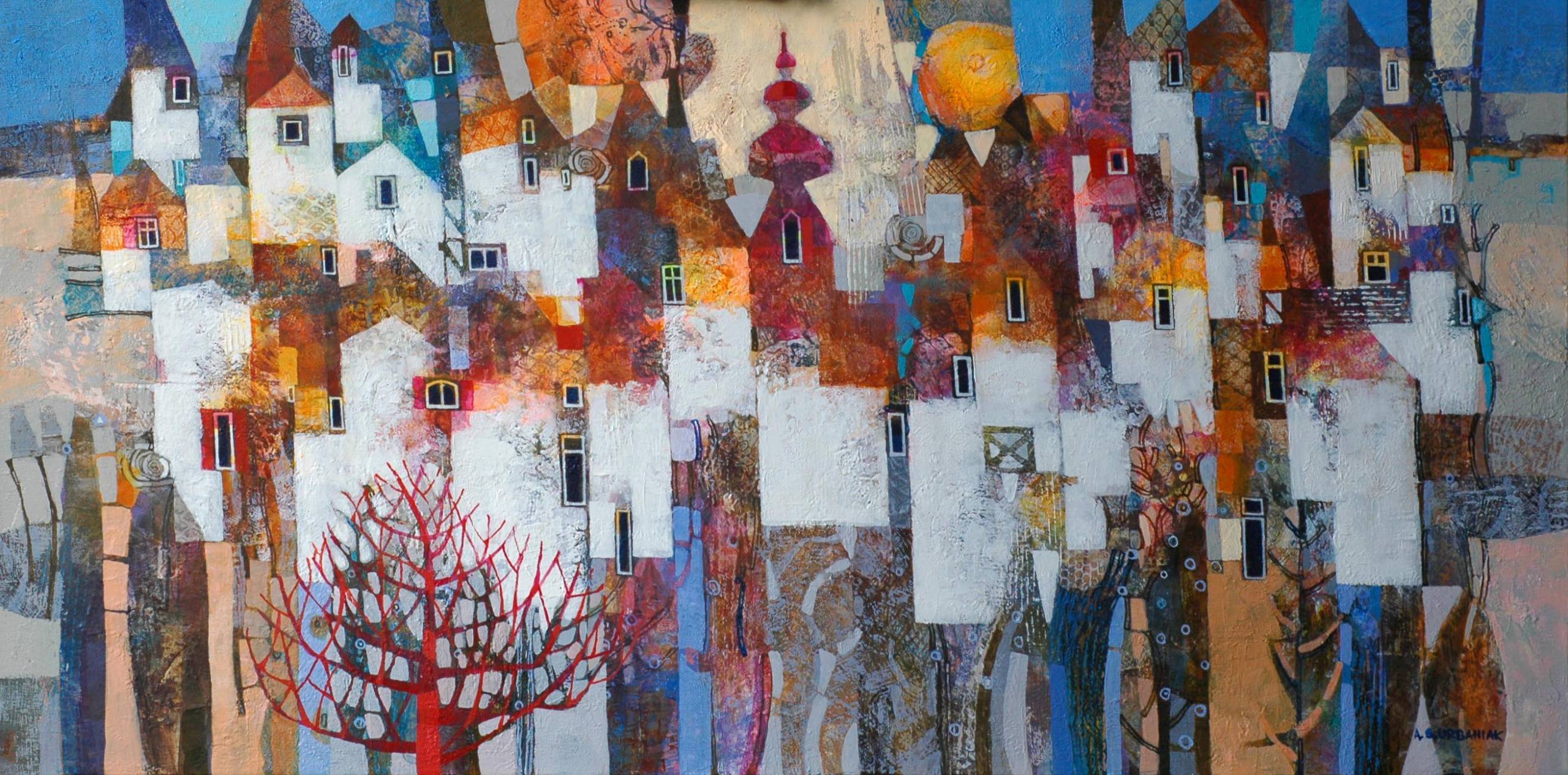 Obraz jest niesamowity! Pełen kontrastujących kolorów, które dosłownie skaczą w moje oczy. Dominuje biel budynków, ale czerwień, pomarańcz i błękit świetnie się z nimi bawią, tworząc kolorowe mozaiki. Wygląda jak miasto z bajki, gdzie wszystko zasłonięte jest pod magiczną mgłą. Kształty są geometryczne, ale niejednoznaczne, co sprawia, że można w nich dostrzec różnorakie historie. Atmosfera obrazu jest pełna tajemnicy i magii. Czuje się, jakby za każdym rogiem czaiła się tajemnica. Technika artystyczna wydaje się być collage, z teksturą, która dodaje głębi różnym partiom obrazu. Przykuwa uwagę i rozwija wyobraźnię. Obraz może budzić w odbiorcy poczucie ciepła i nostalgii, jakbym wracał do miejsc znanych z dzieciństwa. W sumie, trochę jak "fairytale" zamrożona w czasie. Najbardziej podoba mi się czerwone drzewo, które wygląda, jakby machało do przechodniów. Można siedzieć i gapić się godzinami, a zawsze znajdzie się coś innego do odkrycia. To takie fajne!