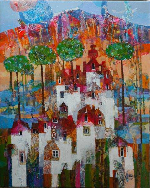 Obraz emanuje feerią barw, przyciągając wzrok intensywnymi odcieniami pomarańczy, czerwieni i niebieskości. Na pierwszym planie widać urocze, białe domki o czerwonych dachach, które wyglądają niczym z bajki. Ich nieregularne kształty układają się w malowniczą kompozycję, pełną uroku i nostalgii. Ponad domkami unoszą się smukłe, ciemne drzewa z okrągłymi, zielonymi koronami. Całość tworzy atmosferę snu, jakbyśmy znaleźli się w magicznym lesie ukrytym przed światem. Styl artysty przypomina nieco dzieła impresjonistyczne, lecz z nutką fantazji. Wykorzystano technikę kolażu z intensywnymi akcentami kolorystycznymi. A te kolory! Przez bogactwo barw można poczuć prawdziwą radość życia, nawet trochę surrealistycznie. Dla kogoś odbiorca to może być ucieczka do beztroskiej krainy dzieciństwa, gdzie każda chwila jest magiczna. Takie obrazy potrafią obudzić w nas ciepłe wspomnienia i tęsknotę za nieosiągalną idyllą. Myślę sobie, że ten świat na płótnie woła: "Adventure awaits!" - przygoda czeka. Dziecko mogłoby powiedzieć: „To wygląda jak cudowny zamek dla krasnoludków!” Forma wyrazu, choć nieco chaotyczna, prowadzi do odkrywania ukrytych znaczeń. Obraz stymuluje wyobraźnię, sprawiając, że każdy widz odkrywa tu coś swojego. To jak podróż bez końca.