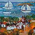 Na obrazie dominują intensywne kolory – od głębokiego błękitu nieba i morza po ciepłe pomarańcze i brązy, które przeplatają się w dolnej części kompozycji. W centrum obrazu królują białe żagle dwóch statków poruszających się po falach, które artysta przedstawił za pomocą dynamicznych pociągnięć pędzla. W dolnej części dostrzegamy urokliwe domki, pokryte jasnym tynkiem, otoczone masywnymi drzewami. Atmosfera dzieła jest spokojna, ale jakby z nutką przygody. Czy ktoś nie marzy by popłynąć takim statkiem w dal? To dzieło emanuje poczuciem harmonii i beztroski, jakby świat dookoła nagle zwolnił i stał się bardziej magiczny. Styl artystyczny można opisać jako mieszankę impresjonizmu i abstrakcji. Artysta używa rozmazanych krawędzi i tekstury, żeby dodać obrazowi dynamizmu. Technika jest niesamowicie intrygująca – widzimy warstwy farby, które tworzą efekt głębi i bogactwa formy. To dzieło pozostawia widza z poczuciem zadowolenia, ale i lekkiej nostalgii za nieznanym. Jakie to fajne że tak się można zagubić w obrazie, prawda? Personalnie, patrząc na ten obraz, czuję wewnętrzną ciszę i spokój. Te kolory i kształty aż zachęcają do zatopienia się we własnych myślach. It's like stepping into a dream. Obraz ten z pewnością zachęca do refleksji nad otaczającym nas pięknem i wartościami życia codziennego, których często nie zauważamy w codziennym pośpiechu.