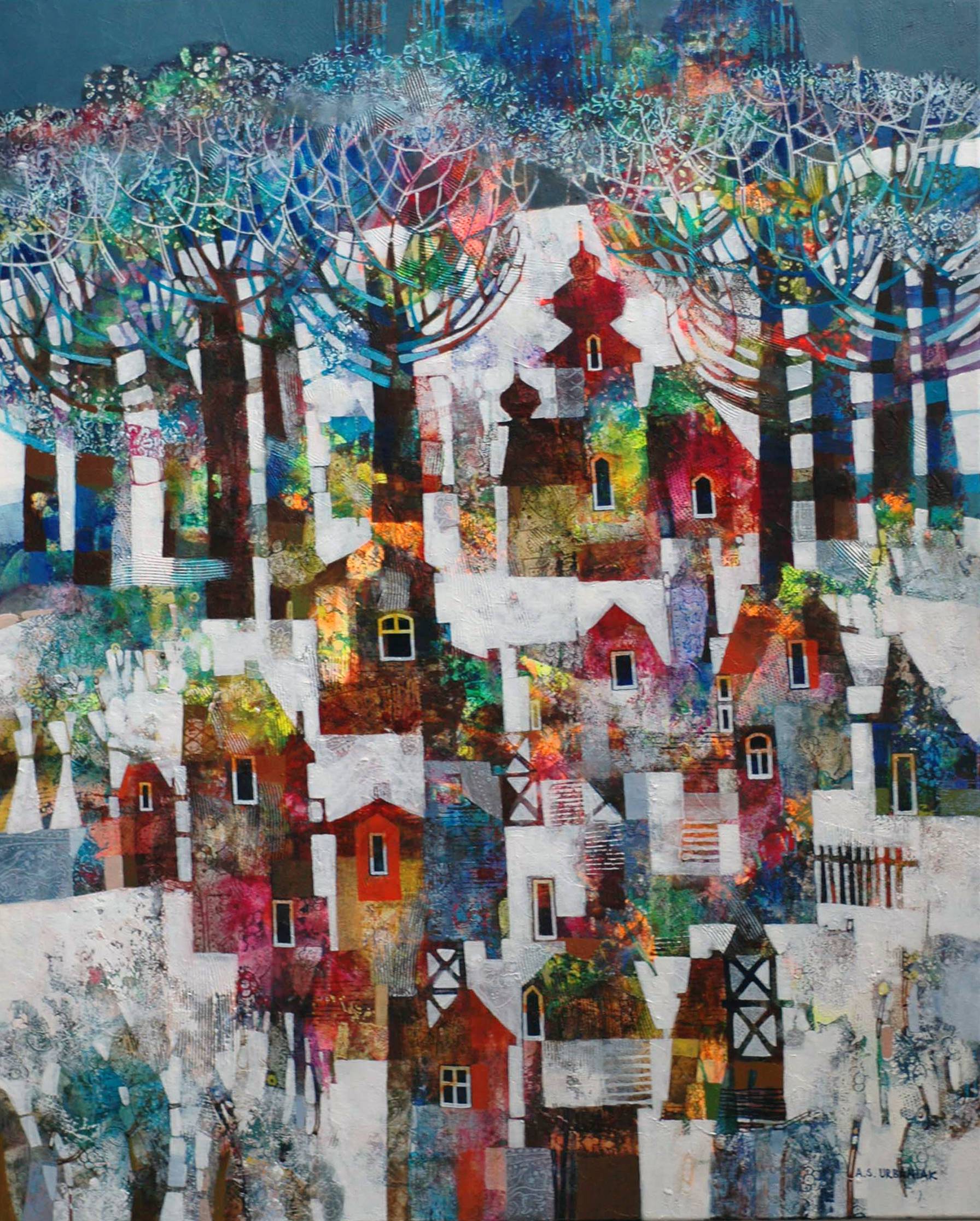 Na obrazie widać baśniowe miasteczko skąpane w zimowej scenerii. W tle dominują wysokie, szare drzewa z gałęziami splecionymi jak haft. W oddali maluje się zarys tajemniczych wież, migoczących różnymi kolorami. Te wielobarwne budynki przypominają chatki ze snu, poukładane niczym puzzle. Barwy są żywe i mieszają się ze sobą w magiczny sposób, tworząc kalejdoskop pełen energii. W końcu, kto by nie chciał się tam przejść? Pierwsze, co rzuca się w oczy, to kontrasty – ciemne drzewo sąsiadujące z blaskiem chat i śniegu. Nastrój jest lekki, jakby obrazy wyjęte z dziecięcej bajki. Artysta użył techniki mieszanej, splatając akrylowe plamy z delikatnym rysunkiem, co dodaje głębi i tajemnicy. Czy to nie jest beautiful? Patrząc na obraz, wyobrażam sobie, jak wędruję tymi uliczkami, a pod stopami chrupie śnieg. Czuję nostalgiczne ciepło domowego ogniska ukrytego w każdej z chat. A wiesz, mi to przypomina święta. Dziecko mogłoby powiedzieć: "To jest kraina marzeń!" Ten obraz pokazuje, jak czasem zwykłe rzeczy mogą być magiczne.