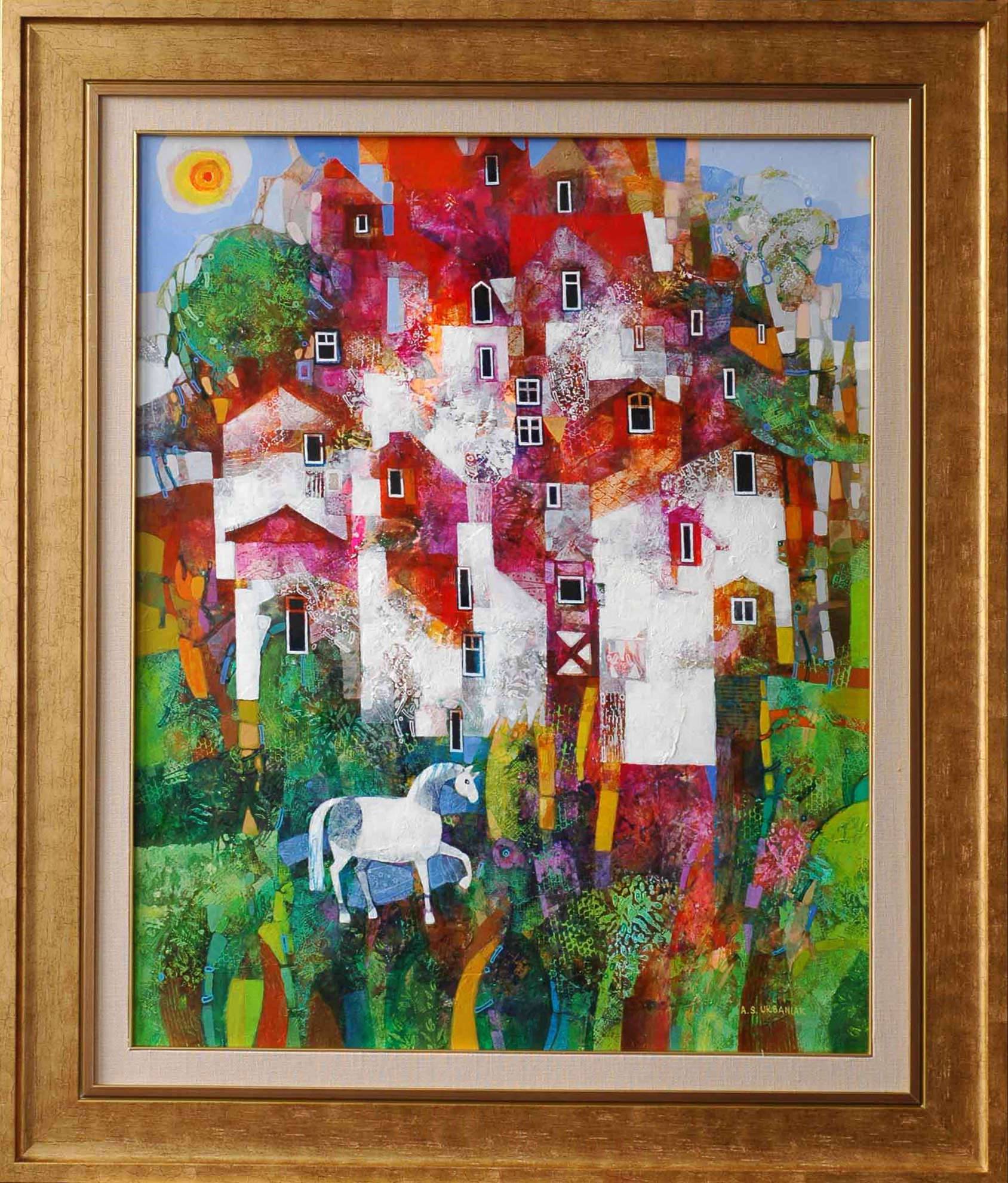 Na obrazie dominują intensywne, żywe kolory. Przeważają głównie czerwienie i zielenie, które przeplatają się z bielą, tworząc dynamiczną i abstrakcyjną kompozycję. Budynki są jak puzzle, z nieco krzywymi oknami, a wszystko to przyciąga wzrok. Nad całością unosi się słońce – jakby namalowane przez dziecko, proste, ale pełne energii. Przyjaciółka małego konika, bo na obrazku jest konik, chodzi sobie w zielonej trawie. Atmosfera tutaj jest pełna marzenia i baśniowości. Jest w niej coś magicznego, jak z sennej wizji, którą chciałoby się przeżyć. Styl obrazu przypomina artystyczny kolaż, wykorzystujący różnorodne techniki – od malarstwa po kolaż – co dodaje mu intrygującej głębi. Czuje się tu pewną beztroskę, a może nawet „freedom” – nieskrępowaną swobodę, która emanuje z tych form i barw. Obraz może wywoływać w odbiorcach uczucie nostalgii albo dziecięcą radość. Jest jakby zaproszeniem do wejścia w świat wyobraźni, gdzie wszystko jest możliwe. Czuję, że ten obraz jest jak podróż do krainy, gdzie każdy szczegół ma znaczenie – i nie sposób oderwać od niego wzroku. To miejsce, gdzie czas płynie inaczej, gdzie każdy kolor opowiada swoją historię.