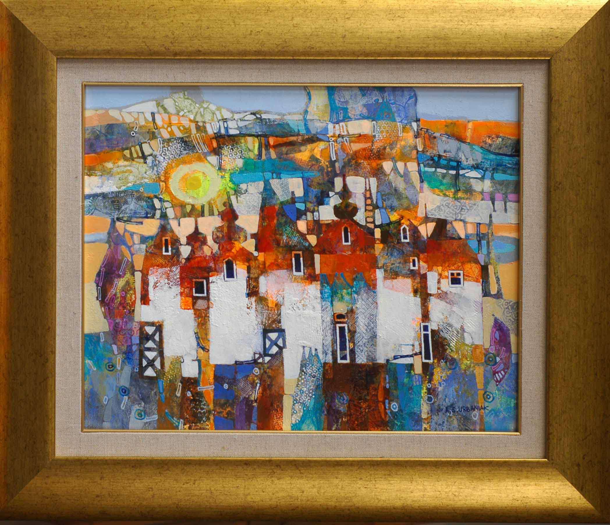 Na obrazie widzimy kalejdoskop barw: intensywne odcienie błękitu, pomarańczu i bieli tworzą niemalże symfonię kolorów. Kształty są geometryczne, ale subtelnie nieregularne, co dodaje kompozycji dynamiki. Dominują tu małe, urokliwe domki o czerwonych dachach, które wydają się być scentralizowane w krajobrazie pełnym wirujących wzorów. Atmosfera płótna emanuje radością i ciepłem, a jednocześnie tchnie odrobiną nostalgii, jakbyśmy zaglądali do wspomnienia z dzieciństwa. Artystyczny styl jest zbliżony do kubizmu z domieszką abstrakcji, co przejawia się w technice nakładania barw warstwami, tworzącymi efekt głębi. Obraz budzi w nas uczucia beztroski i zachwytu, jakbyśmy przenieśli się do magicznej krainy. Mały kotek śpi pod drzewem — dzieci mogłyby tak powiedzieć. Patrząc na ten obraz, czujemy przypływ energii i pewną melancholię za czymś utraconym. Te „houses” zdają się szeptać do widza, że życie jest pełne niespodzianek. Personalnie, kojarzy mi się to z letnimi wieczorami w idyllicznej wiosce, kiedy czas zwalnia, a świat wokół nas otula w spokoju. Fascynująco sią patrzy na to dzieło, zwłaszcza gdy zaczynamy dostrzegać te mikrodetale, których na pierwszy rzut oka nie zauważamy.
