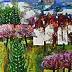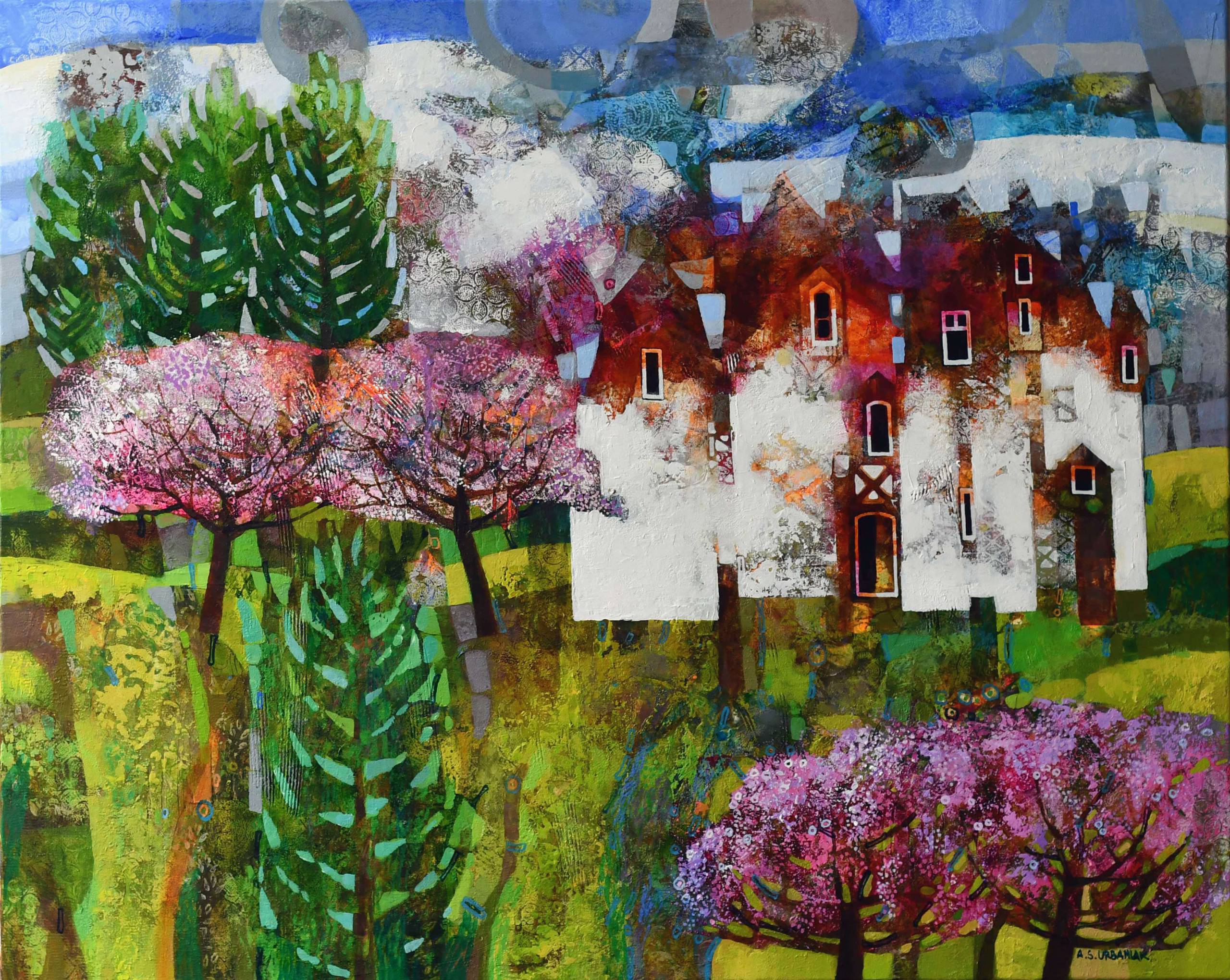 Obraz przyciąga wzrok feerią kolorów i bogactwem kształtów. Dominujące biele domów przeplatają się z burzliwymi odcieniami fioletu i różu, tworząc niezwykłą mozaikę form. Zielenią pulsują drzewa, ich korony tętnią soczystością wiosny, a niebieskie niebo uspokaja dynamikę poniżej. Artysta zręcznie bawi się fakturami, stosując różnorodne techniki malarskie, które dodają głębi i tajemniczości. Ta scena emanuje ciepłem i radością, choć znajduje się w niej nuta melancholii. Atmosfera wydaje się być niczym z bajki, gdzie wszystko jest możliwe. Dzieciak powiedziałby – "Te drzewa są jak szczotki do włosów!" Taki moment zatrzymania w codziennym chaosie. Obraz może przywoływać uczucie nostalgii za beztroskimi dniami spędzonymi na wsi. "Wow", this piece of art, bez dwóch zdań, przyciąga wzrok i porywa serce. Trochę chaotyczne, trochę magiczne. Naprawdę trudno oderwać wzrok, a każdy detal odkrywa kolejne tajemnice i prowokuje do refleksji nad zawiłością i pięknem natury.