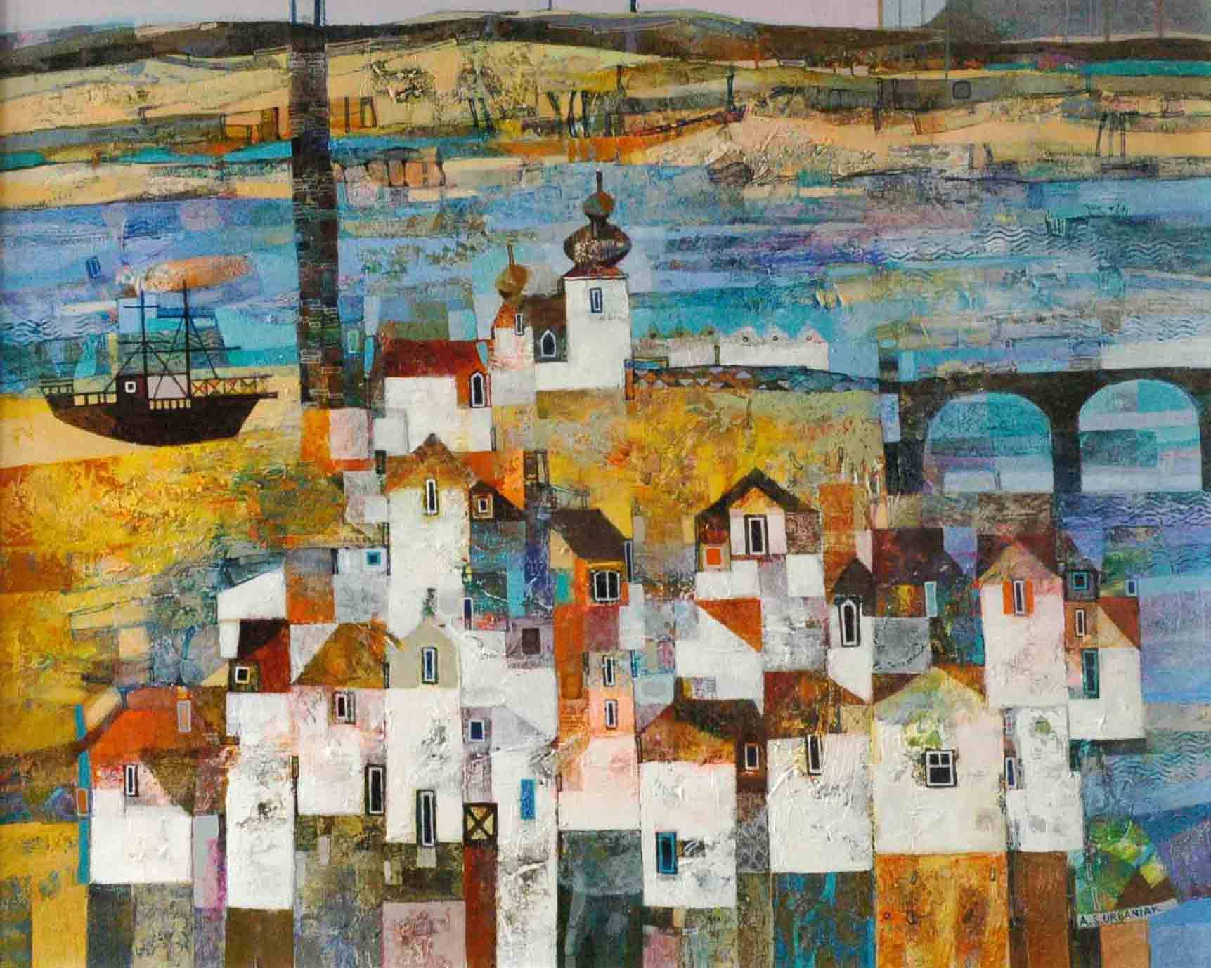 Obraz tętni życiem, każdy kolor i kształt zdaje się wibrować jakby miał swoje osobne pulsowanie. Dominują ziemiste odcienie wymieszane z niebieskościami. W centrum uwagę przyciągają malutkie domki, które wydają się prawie zbudowane z kolorowych klocków. Niezliczone prostokąty tworzą coś w rodzaju chaotycznego, a jednocześnie harmonijnego wzoru. A na prawo - most, który spokojnie siedzi nad wodą. Atmosfera jest nieco magiczna, jakbyśmy patrzyli na sen o nadmorskim miasteczku. Technika kolażu zestawia różne elementy w jedną, spójną całość. Artysta użył "layers" w stylu, który tworzy poczucie głębi. Emocje są sprzeczne. To trochę nostalgia, trochę ciekawość. Czuję się jakbym chciał tam wejść i zobaczyć wszystko na własne oczy! Jak się bliżej przyjrzeć, można dostrzec drobne detale wpływające na interpretację obrazu - te malutkie okienka są jak oczy patrzące w twoją stronę. Obraz nie krzyczy, on szepta. 7-latek by powiedział: "Te domki wyglądają jak puzzle!". I coś w tym jest, bo zestawienie tych kolorów i kształtów tworzy coś, co może być łatwo poskładane na nowo.