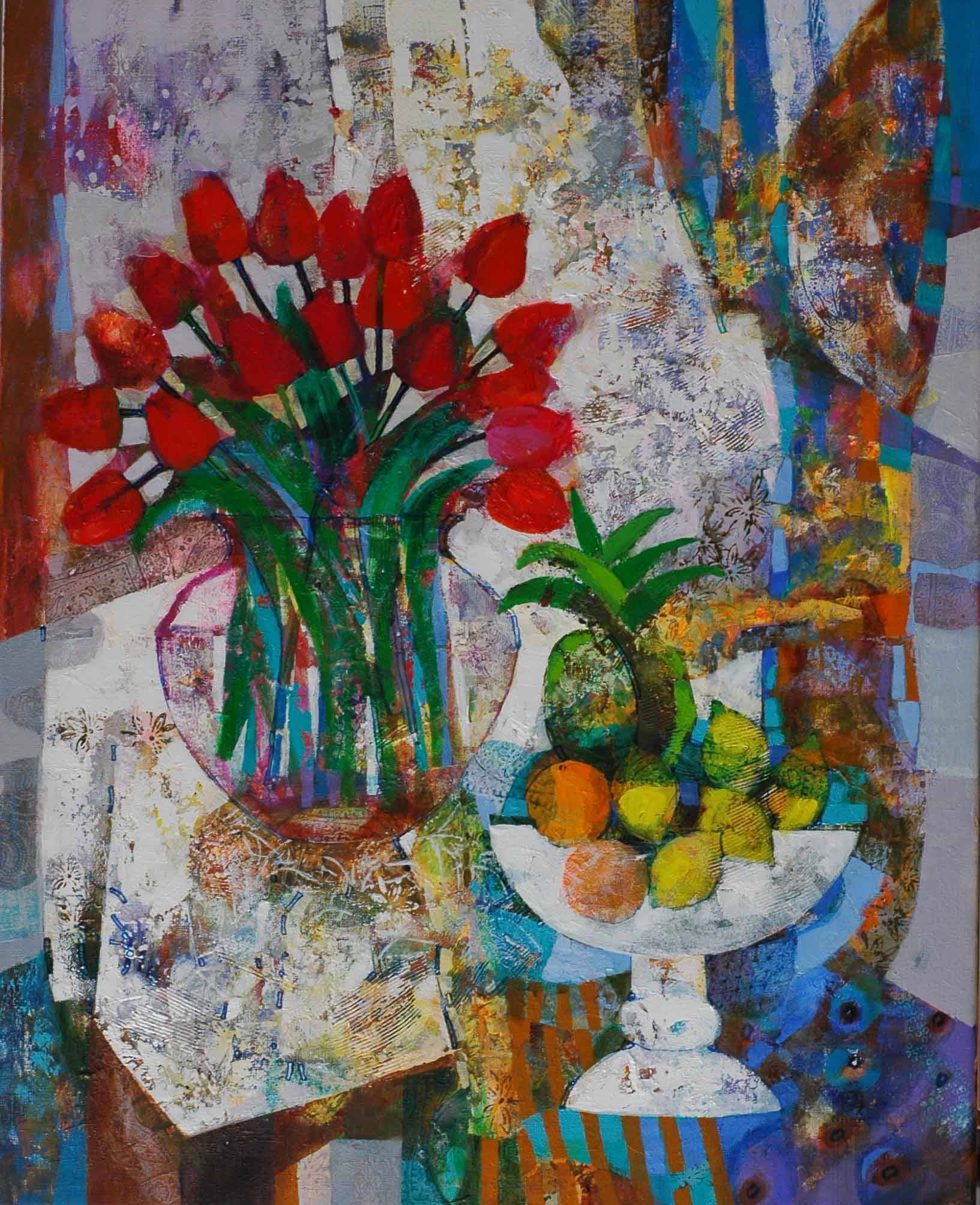 Na obrazie widać bukiet soczyście czerwonych tulipanów w przeźroczystym wazonie. Kolory są intensywne: zielenie liści kontrastują z czerwienią kwiatów. Na pierwszym planie stoi miska pełna owoców—pomarańcze, zielone jabłka, ananas. Tło jest dynamiczne, pełne abstrakcyjnych plam i przetarć w odcieniach niebieskiego i brązu. Taka mieszanka dodaje kompozycji głębi i tekstury. Odbieram to jako little piece of chaos, ale w pozytywnym sensie. Atmosfera obrazu jest ciepła i przyjazna, jakby zapraszała do zatrzymania się na chwilę. Artysta zastosował technikę kolażu i grubych pociągnięć pędzla, co dodaje dziełu żywotności i energii. Duże czerwone tulipany zdają się niemal wychodzić z płótna, a owoce wręcz pachną soczystością! Dziecko powiedziałoby: "Owoce wyglądają smakowicie, jakbym mógł ich dotknąć!" Obraz emanuje subtelnym ruchem i spokojem jednocześnie. Jego warstwowa struktura i jaskrawe barwy wzbudzają we mnie poczucie radości, ale i nostalgii. Może to przypominać widzowi domowe ciepło i prostą przyjemność. Nie można nie ulec urokowi tego artystycznego zamieszania. Podsumowując, to kompozycja pełna życia i nastroju, która wzbudza uśmiech na twarzy.