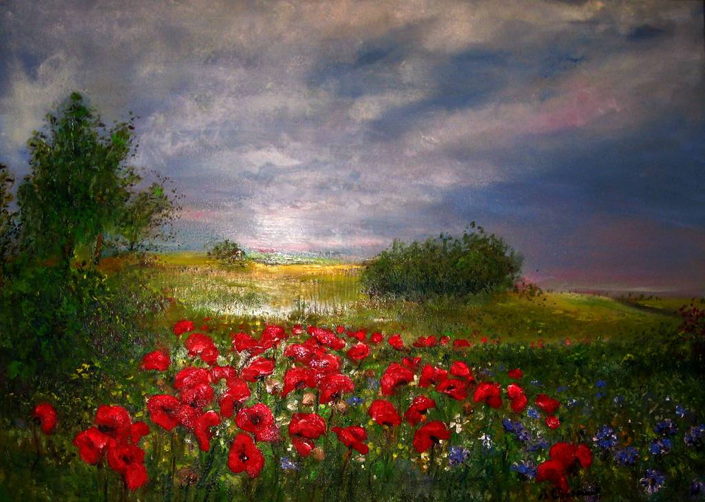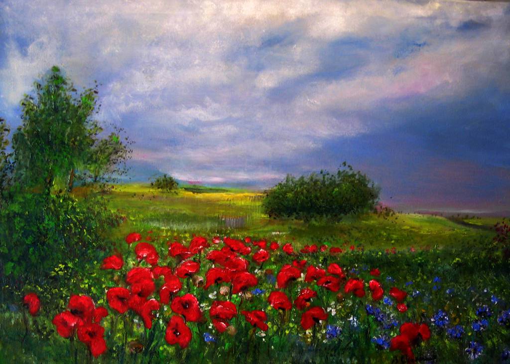 Na obrazie widzimy urokliwą łąkę pełną barwnych polnych kwiatów. Dominują czerwone maki, które wybijają się na tle zielonych traw i niebieskich chabrów. Krajobraz jest otoczony przez delikatne kępy drzew, a tło stanowi niebo pokryte chmurami w odcieniach błękitów i różu. Kompozycja jest przejrzysta i harmonijna, prowadząc wzrok od jasnych kwiatów po horyzont, gdzie zieleń spotyka się z błękitem nieba. Atmosfera obrazu jest naprawdę spokojna. Można niemal poczuć delikatny wiatr i zapach świeżych kwiatów. Dzieło emanuje sielankowym klimatem, przypominając o leniwych letnich dniach spędzanych na łonie natury. Artysta posłużył się subtelną techniką olejną, co nadaje obrazowi głębi i soczystości kolorów. Pędzelki, jakby dotknęły płótna z lekkością, tworząc miękkie, ale wyraziste plamy barwne. Patrząc na ten obraz, czuję spokój i tęsknotę za wolnością. Właśnie dlatego, jest tak magiczny. Jakby mówił: "Zatrzymaj się na chwilę i ciesz się prostym pięknem". W dziele widoczne są impresjonistyczne elementy, które dodają mu lekkości i dynamiki. Dzieci powiedziałyby: "To jak bajka o kwiatkach i chmurach". A ja, patrząc na tą łąkę, myślę sobie, że czasem natura jest najlepszym artystą. W końcu, to takie freedom.
