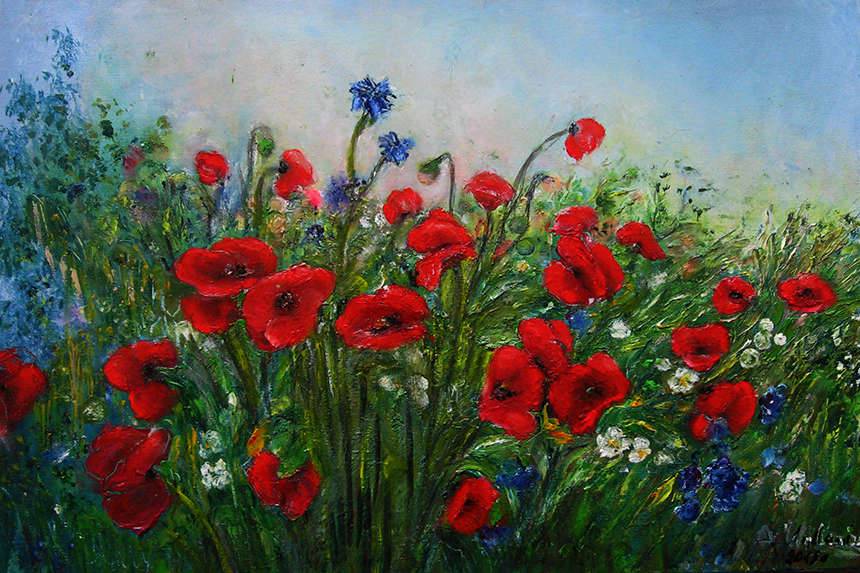 Na obrazie widać bujne pole kwiatów z dominującymi czerwonymi makami, które przyciągają wzrok swoim intensywnym kolorem. Pomiędzy nimi widać niebieskie chabry i białe drobne kwiatki, tworzące harmonijną kompozycję pełną kontrastów. Tło jest delikatne i rozmyte, oddając wrażenie poranka, kiedy mgła jeszcze unosi się nad ziemią. Całość wygląda jak scena z magicznego ogrodu, gdzie natura w pełni celebruje swoje piękno. Atmosfera obrazu jest spokojna i sielankowa, jakby czas zwolnił. Można poczuć lekki powiew wiatru i usłyszeć cichy szum liści. Styl, w którym utrzymane jest to dzieło, nawiązuje do impresjonizmu; artysta użył szybkich, dynamicznych pociągnięć pędzla, co dodaje lekkości i ulotności. Kolory są żywe, ale utrzymane w subtelnej palecie, co oddaje naturalność całej sceny. To obraz, który wywołuje w widzu uczucie radości i tęsknoty za letnimi dniami spędzonymi na łonie natury. Patrząc na to dzieło, ma się ochotę na chwilę zamknąć oczy i wyobrazić sobie siebie wśród tych kwiatów. Wow, zobaczcie te czerwone kwiatki, są jak ogień! Dzieci byłyby zachwycone. Może to nostalgia za czymś, co minęło, a może po prostu czysta przyjemność obcowania z pięknem. Użyte elementy, jak i kolorystyka, sprawiają, że mamy do czynienia z prawdziwym eye-catcherem.