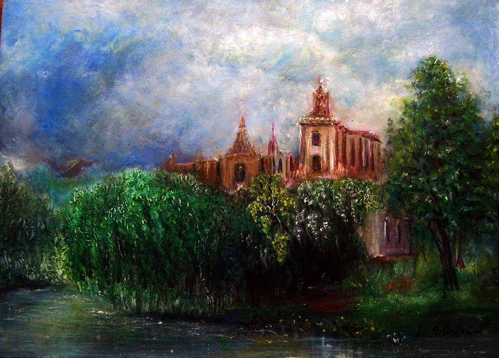 Obraz emanuje spokojem, choć jednocześnie skrywa w sobie pewną tajemniczość. Dominują w nim głębokie zielenie drzew i krzewów, które kontrastują z jasnym, niebieskawym niebem pełnym puchatych chmur. Centralny punkt to majestatyczny budynek o ciepłym, ceglanym odcieniu, otoczony bujną roślinnością. Z jednej strony jakby sielska wiejska scenka, z drugiej – monumentalne echo przeszłości. Technikę można by określić jako impastową, co nadaje dziełu struktury i głębi. Pociągnięcia pędzla są energiczne, jakby artysta chciał uchwycić chwilę w ruchu – to jak malowanie z duszą. Klimat obrazu wywołuje nostalgię. Może przypomnieć spacer po parku o zmierzchu, kiedy światło powoli gaśnie, a w powietrzu unosi się chłodny powiew. To miejsce, gdzie można się zadumać. Taki trochę "mysterious mood". Dziecko powiedziałoby: "Ja tam chcę zamieszkać z królikami!" Oglądając to dzieło, czuję spokój, ale też pragnienie, by dowiedzieć się, co kryje się za tymi murami.