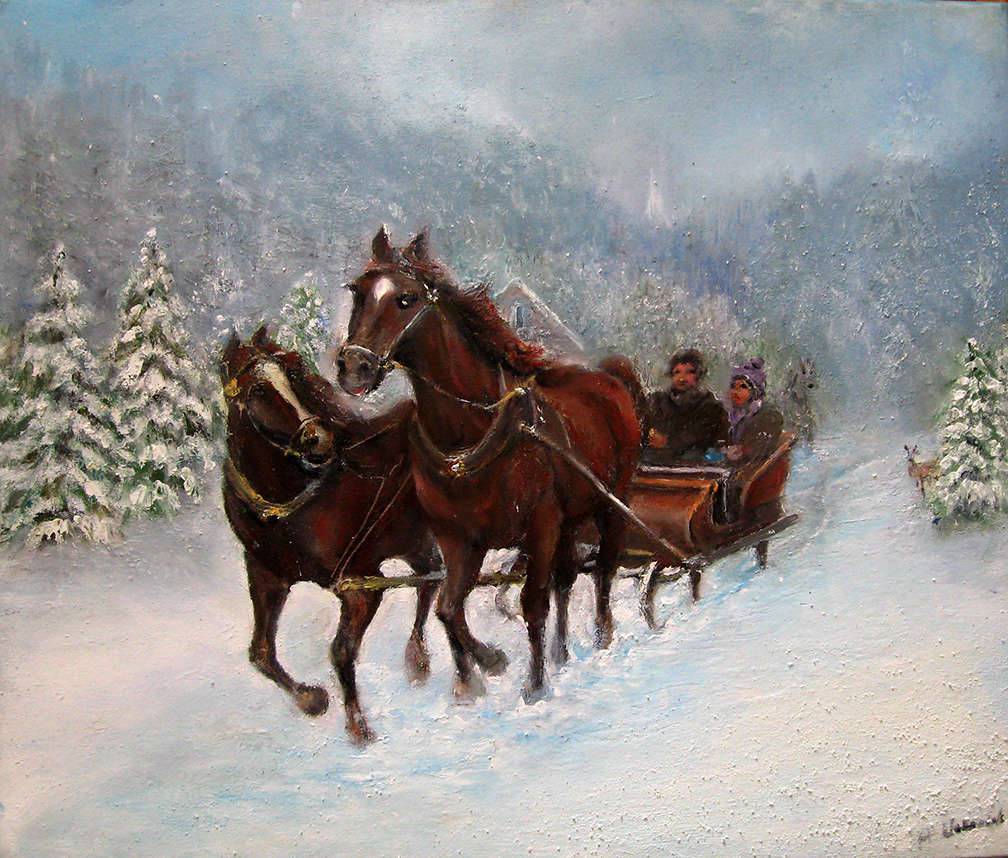 Obraz przedstawia zimową scenę z saniami ciągniętymi przez konie, przemierzającymi zaśnieżony krajobraz. Przeważają chłodne odcienie błękitu i bieli, które kontrastują z ciepłymi brązami koni i sanek. Kompozycja jest dynamiczna, jakby konie naprawdę biegły, zostawiając za sobą wiry śnieżnego pyłu. Atmosfera obrazu jest magiczna, niczym wyjęta z bajki zimowej, gdzie mróz szczypie w policzki, a śnieg błyszczy jak diamenty. Styl malarski wskazuje na realistyczny i szczegółowy sposób ukazania tematu, z delikatnymi pociągnięciami pędzla imitującymi fakturę puszystego śniegu. Obraz emanuje spokojem i jednocześnie poczuciem przygody. Można prawie usłyszeć dźwięk dzwoneczków na uprzęży koni. Jest to scena, która przenosi odbiorcę do czasów, gdy życie płynęło wolniej, a zima była okazją do zabawy na świeżym powietrzu. I jest zima i są konie. Ten malunek, with its charming execution, sprawia, że czujemy ciepło mimo mroźnej scenerii. Coś tam w duszy gra, budząc nostalgiczne wspomnienia z dzieciństwa, gdy śnieg był czymś więcej niż tylko zimnym hałasem. Jest w tej pracy coś ujmującego, co zatrzymuje na chwilę codzienny pośpiech. Dzieło zaprasza do chwili refleksji nad pięknem prostych chwil i natury.