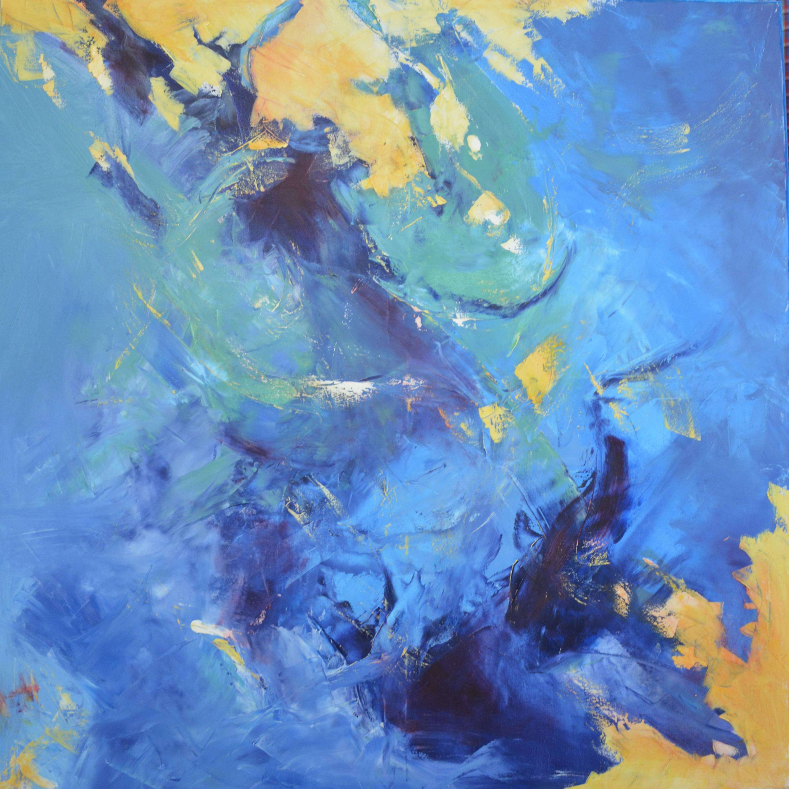Na obrazie dominują odcienie niebieskiego, zieleni i żółci, które tańczą ze sobą w wirze abstrakcyjnych kształtów. Kolory mieszają się, tworząc dynamiczną kompozycję pełną energii, jakby co chwilę miała wydobyć się z płótna. Plamy i pociągnięcia pędzla są odważne, a faktura farby dodaje głębi. Atmosfera jest tak jakby ruchliwa, pełna napięcia, ale i łagodna jednocześnie. Trochę jak ocean w sztormie. Styl dzieła można określić jako ekspresjonistyczny, z nutą impresjonizmu. Artysta korzysta z szerokich pociągnięć pędzla, by w pełni oddać swoją wizję emocji. Czuję ekscytację i trochę tajemniczości, patrząc na to dzieło. "Wow, ale fajne kolory!" - mogłoby powiedzieć dziecko. Każdy z nas zapewne zobaczy tu coś innego - może to być burza, taniec, albo po prostu gra świateł. Patrząc na obraz, czuję jakby czas się zatrzymał. Może to "chaos", ale jest w tym piękno. Fascynuje mnie ten taniec kolorów i faktur, który przyciąga wzrok i wywołuje różne uczucia. Obraz pokazuje, jak natura i abstrakcja mogą ze sobą współpracować w niesamowicie harmonijny sposób.