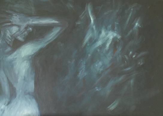 Obraz, który widzimy, emanuje tajemniczością i melancholią. Dominują w nim zimne odcienie niebieskiego i szarości, które zdają się okrywać postać mglistą aurą. Ta postać, umieszczona po lewej stronie, ma subtelne linie ciała, które są prawie rozmazane, sprawiając, że wygląda jakby stawała się częścią otaczającej ją przestrzeni. Z drugiej strony, abstrakcyjna kompozycja kształtów tworzy na płótnie pewien ruch, niemalże taniec barw i linii. Atmosfera jest nieco oniryczna, jakbyśmy zaglądali w świat snów lub wspomnień. Styl artysty zbliża się do impresjonizmu, z delikatnym zastosowaniem pędzla, które daje efekt rozmycia. Można wyczuć pewną dynamikę w tych niejasnych kształtach, jakby postać prowadziła dialog z czymś innym, nieokreślonym. Emocje wywoływane przez obraz to głównie introspekcja, niepokój czy nawet smutek. Kiedy patrzę na ten obraz, czuję chłód, jakby mroźny wiatr przenikał mnie do szpiku kości. It feels like a whisper in the dark. Mogę się też zastanawiać, jakie myśli lub marzenia skrywają się za tą postacią. Dla dziecka mogłoby to być "Duchy tańczą w ciemnym lesie", co dodaje całości element zabawy i wyobraźni. Patrząc na obraz, widzę nie tylko to, co jest namalowane, ale i to, co ukryte między pociągnięciami pędzla.