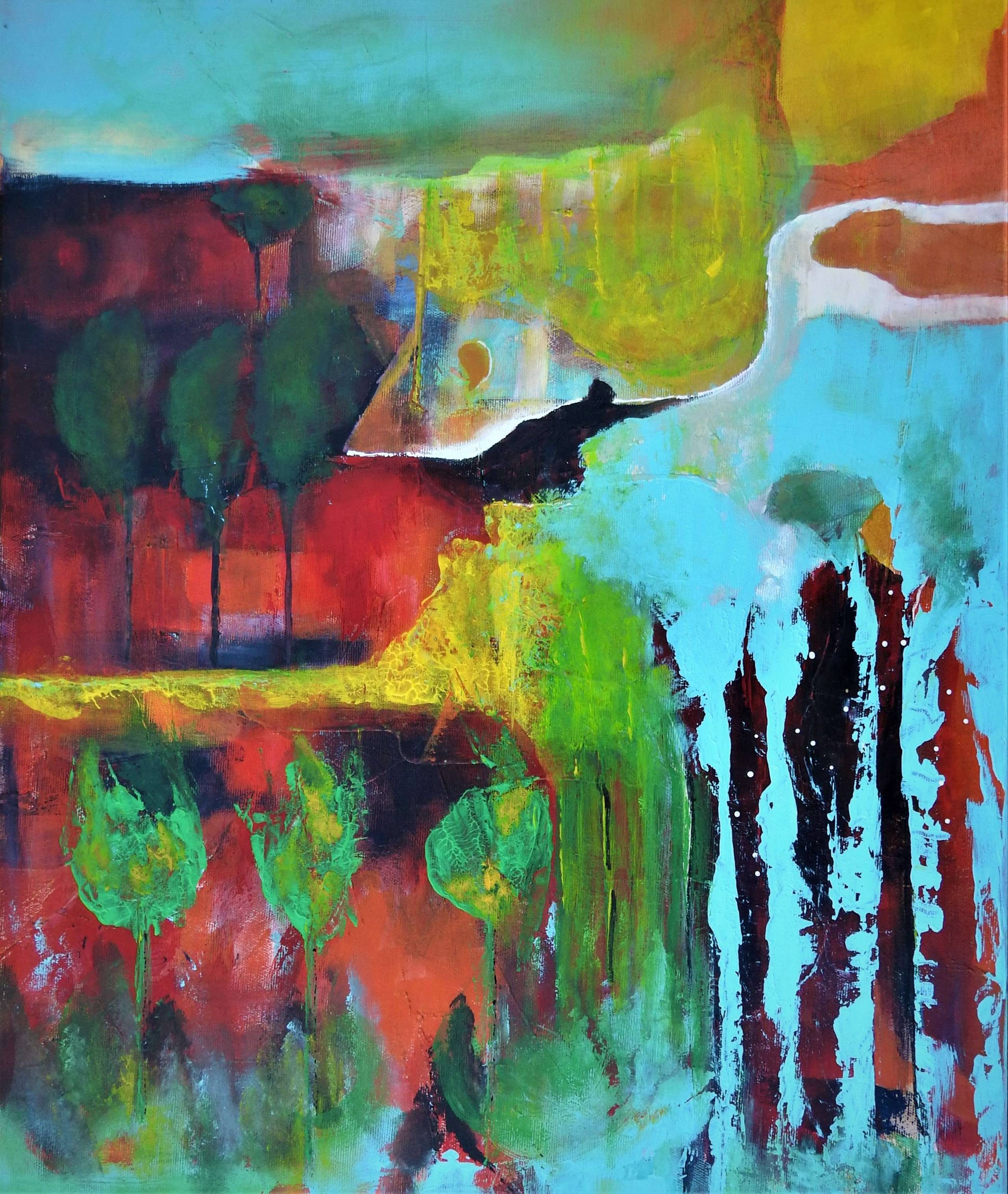 Optymistycznie ujęty temat natury : drzewa, woda, pola. Obraz abstrakcyjny akrylowy na podobraziu bawełnianym 60 x 50. Boczne krawędzie płótna zamalowane, zbędna więc rama. Zawerniksowany błyszczącym werniksem. Obraz sygnowany z przodu nazwiskiem autora / Alicja Wysocka i rok powstania 2020. Praca " Krajobraz z drzewami " może rozjaśnić współczesne wnętrze, dlatego też może stać się miłym prezentem, zwłaszcza dla młodych odbiorców nowoczesnej sztuki.