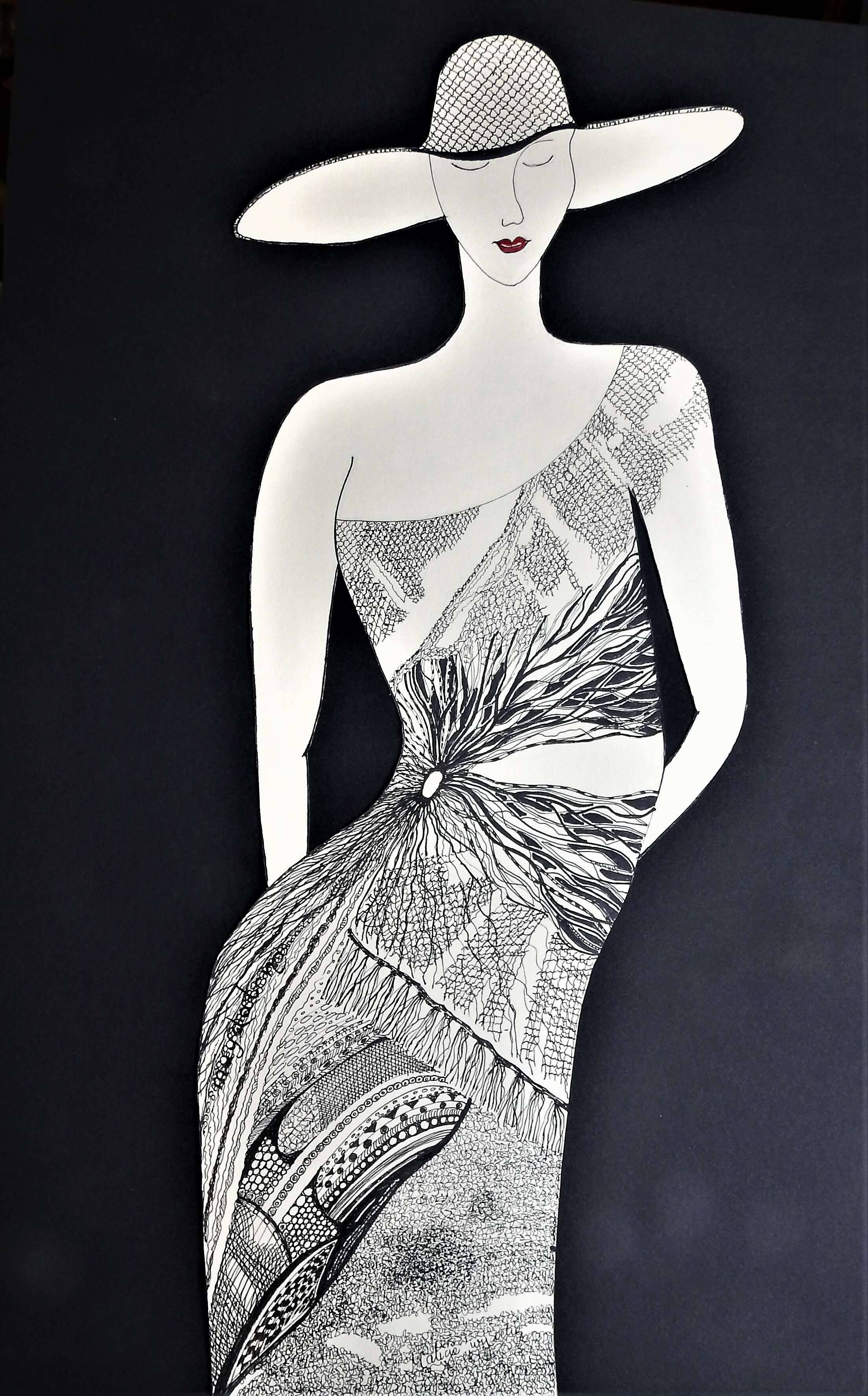Dziewczyno...jesteś zawstydzona czy nieśmiała?Pięknie otulona w koronkową, delikatnie utkaną suknię..Rysunek wykonany tuszem i farbą akrylową na papierze Cansona. Postać wycięta i przyklejona do czarnego papieru o wymiarach 40 x 60. Rysunek pięknie ozdobi każde wnętrze.