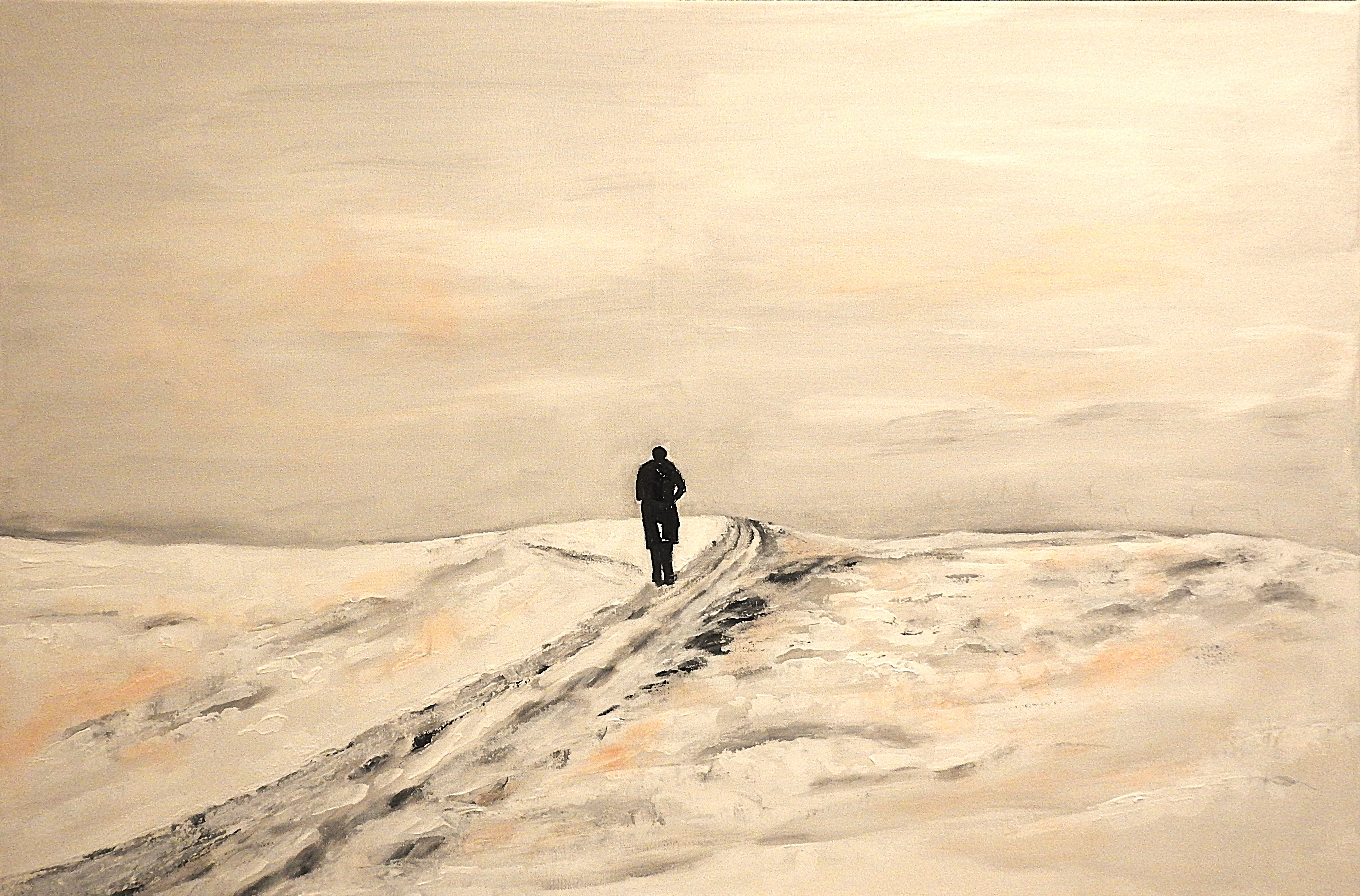 Minimalistyczna kompozycja w ciepłych, piaskowych tonach. Postać na horyzoncie symbolizuje wewnętrzną podróż, odwagę i podążanie własną ścieżką. Obraz o spokojnej, refleksyjnej energii — idealny do przestrzeni sprzyjających wyciszeniu.