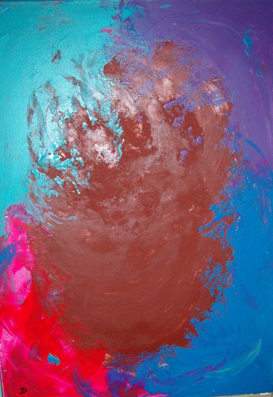 Na obrazie dominują intensywne kolory, które tworzą dynamiczną kompozycję. Zobaczymy tu mieszankę turkusowego i fioletowego tła, kontrastujących z ciepłym, czerwonobrązowym centrum. Barwy płynnie przechodzą jedna w drugą, a ich rozmieszczenie przywodzi na myśl wirującą energię. Atmosfera jest pełna intensywności i ruchu, jakby obraz miał za chwilę zacząć tańczyć. Artysta zastosował technikę impasto, co widać w grubych warstwach farby, dających teksturę i głębię, jakby obraz chciał wyskoczyć z płótna. Obraz może budzić w widzach ekscytację, a nawet pewien niepokój. Wywołuje skojarzenia z dynamicznymi zjawiskami przyrodniczymi, jak erupcje wulkanu lub burzliwe niebo. What a mess! To exclamation może przejść przez głowę tych, którzy dopatrują się chaosu w harmoni kolorów. Może nawet wzbudzić refleksje nad siłami natury i nieprzewidywalnością świata. Dziecko powiedziałoby, że to wygląda jak kałuża błota w czasie deszczu. Emocje, jakie wywołuje, są intensywne - od fascynacji po lęk. Pisząc o nim, czuję, że artysta mógł chcieć oddać nieskrępowany ruch i żywiołowość. Kształty są nieregularne, niemalże organiczne, przypominając, że czasem najlepsze rzeczy wynikają z chaosu i przypadku. Jest w tym coś niezwykle angażującego.