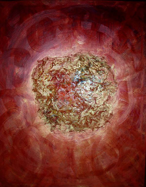 Obraz ten to prawdziwy kalejdoskop barw. Dominują tu głównie odcienie czerwieni i brązu, które wirują wokół centralnej kompozycji. W samym środku widzimy nieregularną formę przypominającą kamień, która zdaje się unosić w przestrzeni. Sucha, chropowata faktura daje wrażenie, jakby sam obraz oddychał. Jest coś magnetycznego w tym chaosie kształtów. Nastrój całości jest intensywny, może nieco niepokojący, jakbyśmy patrzyli na coś nieuchwytnego i tajemniczego. Styl? To połączenie abstrakcji z surowymi fakturami, coś jak clash dwóch światów artystycznych. Artysta zastosował odważne pędzla ruchy, niemalże brutalne, a jednak w tym szaleństwie jest metoda. Przepraszam, ale te pociągnięcia pędzlem mają swoją własną język - taki "raw" wyraz artystyczny. Patrząc na ten obraz, można poczuć w środku mieszankę emocji - od lekkiego niepokoju, po czystą fascynację. Czy to złota kula, czy może skała na obcej planecie? Jakby dziecko spojrzało, powiedziałoby: "To wielka brązowa piłka!" Mam wrażenie, że zanurzając się w tym dziele, możemy odkrywać jego kolejne warstwy. Że coś jeszcze czeka na odkrycie pod powierzchnią. Może to właśnie jest ta tajemnica, która sprawia, że wracamy wzrokiem do obrazu z nowymi pytaniami w głowie.