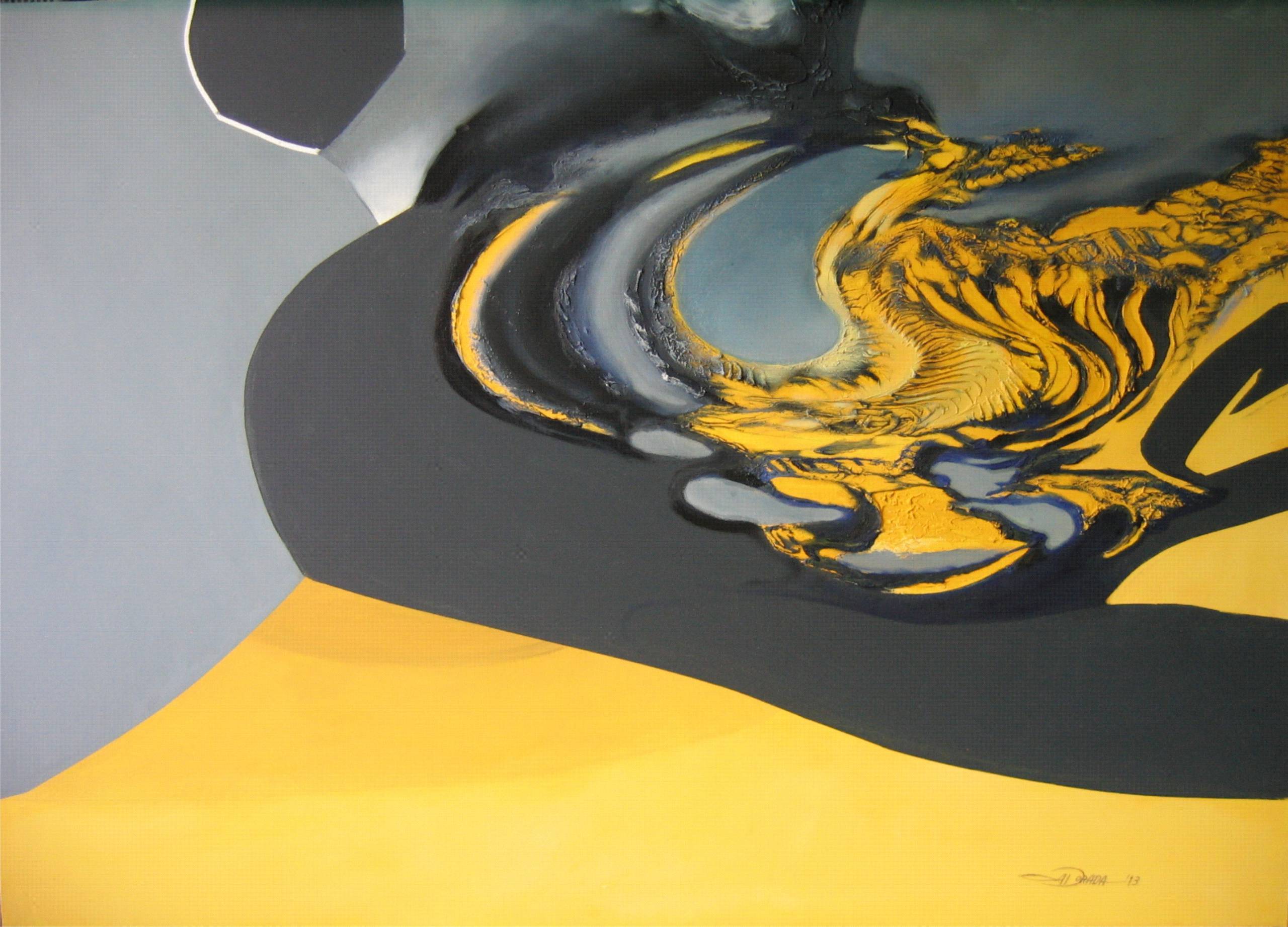 Obraz emanuje dynamiczną energią za sprawą kontrastujących kolorów: głębokiego antracytu zderzonego z intensywnym, ciepłym żółtym. Kształty płyną i wirują, niczym taniec kolorów na płótnie. Kompozycja jest prawdziwą eksplozją abstrakcji, której centralny punkt przypomina wirującą galaktykę lub abstrakcyjny pejzaż. Atmosfera jest niezwykle wciągająca, trochę tajemnicza, jakby skrywała sekret. Patrząc, można poczuć się jak wciągnięty w wir nieznanego. Styl artysty jest nowoczesny, a jego techniki są wyjątkowo kreatywne. Użycie szerokich pociągnięć pędzla, które tworzą głębię i teksturę, dodaje dziełu charakteru. Sam obraz może przywodzić na myśl burzę emocji, od zachwytu po niepokój. Czy to może być ocean na odległej planecie? Dzieło sprawia, że zastanawiam się nad granicami percepcji. Wow, to jak marzenie w kolorach! To trochę jak oglądanie jednej z fal na morzu, ale w wersji "artsy". Dla mnie osobiście obraz ten jest jak podróż do wnętrza kosmosu, gdzie wszystko jest możliwe. Fascynujące.