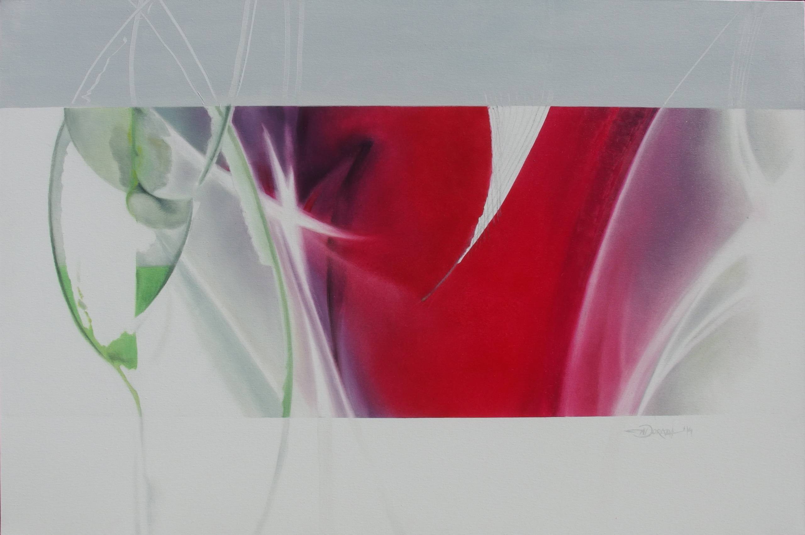 Ten obraz to eksplozja kolorów, które jakby tańczyły na płótnie. Dominują intensywne czerwienie połączone z subtelnymi odcieniami zieleni i bieli, tworząc dynamiczną kompozycję. Kształty są abstrakcyjne i płynne, dając wrażenie nieuchwytnych ruchów. Atmosfera obrazu jest niezwykle ekspresyjna, pełna energii i tajemnicy. To tak, jakby artysta chciał uchwycić moment, który ulatuje przed naszym wzrokiem. Technika, z której skorzystał twórca, to zdecydowanie airbrush, dający efekt delikatnych przejść i niemal eterycznego rozmycia. Obraz może budzić różne emocje – od zachwytu po zamyślenie nad ulotnością chwili. Dla mnie wygląda jak światło wpadające przez witraż. Ciekawość i niepewność mieszają się z podziwem dla kolorystycznej harmonii. To takie magiczne! Efekt „dynamic glow” sprawia, że dzieło jest niemal hipnotyzujące, przyciągające wzrok. Każdy, kto na niego spojrzy, znajdzie własne, unikalne znaczenie ukryte w tej kolorowej abstrakcji. A ja myślę, że to trochę wygląda jak kosmos i galaktyka.