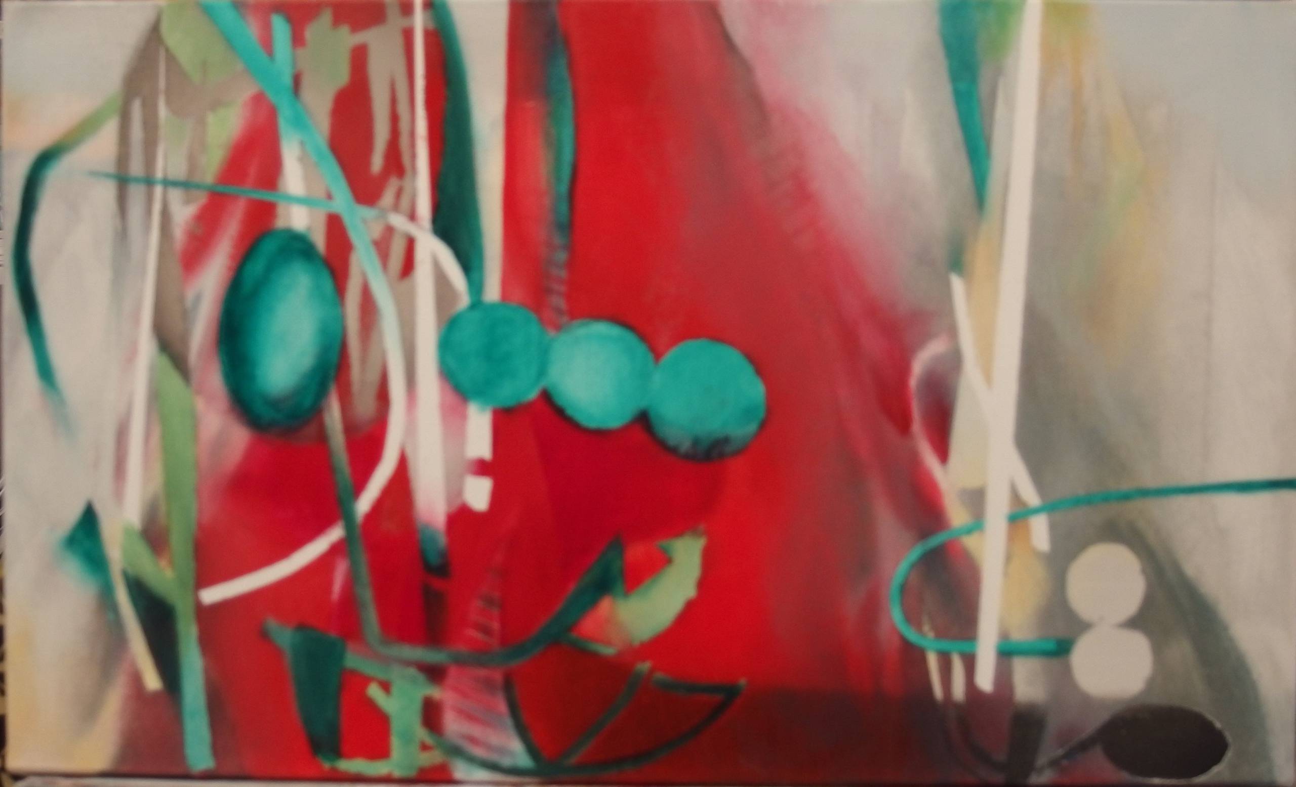 Obraz to dynamiczna eksplozja barw i form, w której dominuje intensywna czerwień tła kontrastująca z turkusowymi i białymi elementami. Kształty są abstrakcyjne, przypominają przeplatające się linie i kształty o organicznych krawędziach. Kompozycja wydaje się chaotyczna, lecz w tej pozornej przypadkowości tkwi harmonia, jakby każdy z elementów miał swoje miejsce w tej artystycznej układance. Atmosfera obrazu jest żywa, pełna energii, pobudza zmysły i zaprasza do głębszego zrozumienia. Artysta zastosował technikę przypominającą action painting, gdzie dynamiczne pociągnięcia pędzla nadają obrazowi wrażenie ruchu. Kolory sprawiają, że dzieło emanuje radości atmosferą, ale jednocześnie kryje w sobie pewną tajemnicę. Możliwe, że chce nam coś powiedzieć. Może o marzeniach? A może o chaosie myśli. Odbiorca może odnaleźć w tym obrazie różnorodne emocje, od euforii po ukojenie. Może on przypominać swobodne skojarzenie, freedom, gdzie nic nie ogranicza naszych interpretacji. Wydaje mi się, że obraz to manifest wolności i ekspresji artysty. Przywołuje na myśl beztroskie dzieciństwo i wspomnienia o malowaniu niebo kredkami. Ten obraz to czysta radość tworzenia.