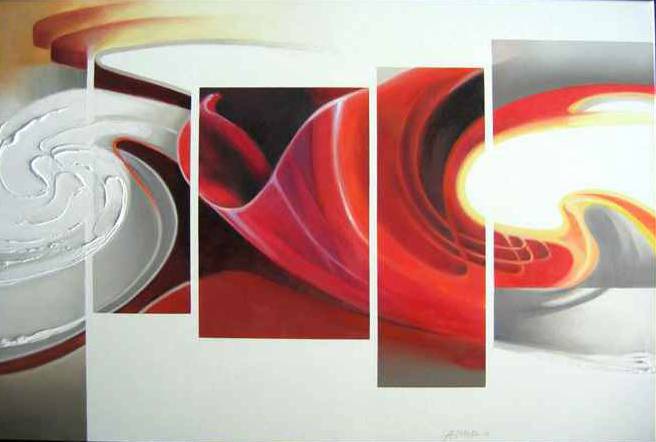 Obraz na pierwszy rzut oka przyciąga intensywnością kolorów: głównie czerwieni, bieli i subtelnych odcieni szarości. Te barwy przeplatają się w dynamicznej kompozycji pełnej zakręceń i falistych linii. Elementy w formie paneli tworzą wrażenie ruchu, jakby całość była w ciągłym przepływie. Z jednej strony mamy biel i delikatne smugi szarości, które kojarzą się z ciszą porannego nieba. Z drugiej, czerwone akcenty nadają obrazowi ognisty, wręcz burzliwy charakter. Całość łączy nowoczesny styl z pewną abstrakcyjną wolnością, która przyciąga wzrok i hipnotyzuje. Atmosfera jest jednocześnie spokojna i pełna energii. Chociaż obraz zdaje się być chaotyczny, w tym chaosie jest jakaś dziwna harmonia. Ten styl, z ostrymi liniami i mieszanką kolorów, przypomina mi modern art. Dla niektórych to dzieło może symbolizować zderzenie żywiołów czy energie życia. Osobiście, patrząc na to, czuję pewne poruszenie, jakby przypominało mi o wewnętrznych konfliktach, które toczą się w każdym z nas. It's like a dance of elements. A może to po prostu wizja energii i ruchu? Jak powiedziałby 7-latek - to wygląda jak bitwa ognia i lodu! Każdy może dostrzec coś innego, co cieszy, bo sztuka powinna być właśnie taka wieloznaczna.