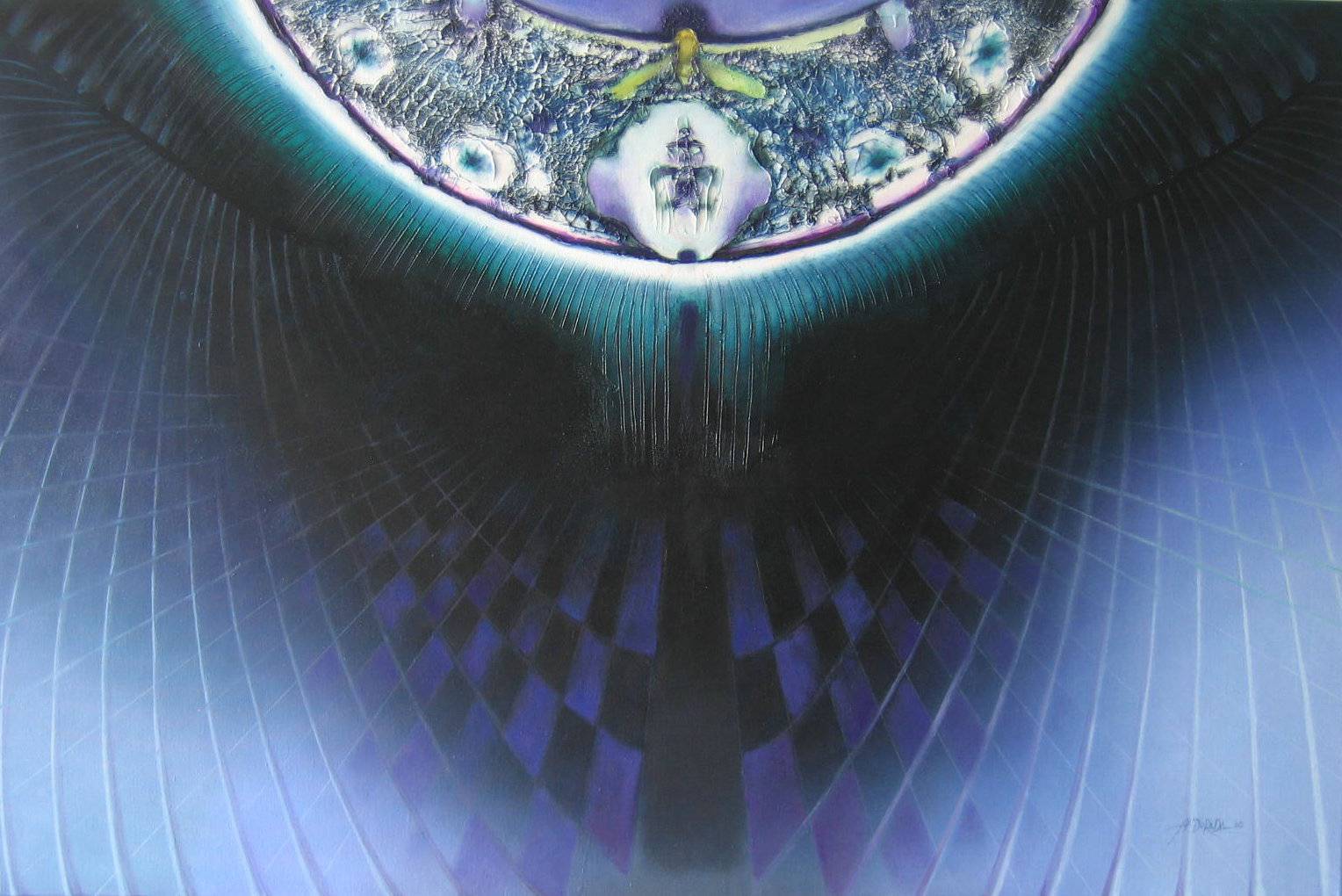 Obraz emanuje tajemniczą aurą, fascynującą paletą barw od głębokiej czerni po intensywny fiolet i błękit. Centralny punkt to kolorystyczny wir, przypominający oko niebiańskiego cyklonu, otaczający abstrakcyjną formę na górze. Linie rozchodzą się promieniście, tworząc wrażenie ruchu i dynamiki. Atmosferę można określić jako enigmatyczną, wręcz kosmiczną – jakbyśmy patrzyli na kadr z science fiction. Technika? Mistrzowskie połączenie malarstwa i graficznej precyzji – splatanie geometrycznych kształtów z organicznymi, nieco chaotycznymi formami. Całość przemawia do nas językiem surrealizmu, zachęcając do osobistych refleksji i poszukiwania ukrytych znaczeń. Dla jednych to podróż wgłąb równoległego wszechświata, dla innych – metafora wnętrza ludzkiego umysłu. Obraz wciąga, pobudza zmysły i wypełnia umysł pytaniami bez odpowiedzi. "To wygląda jak tajemnicze oko kosmosu!" powiedziałby dzieciak, z błyskiem w oku. No i właśnie, patrząc na to dzieło, czuję się trochę jak odkrywca, gotowy na niezwykłą podróż. It's captivating!