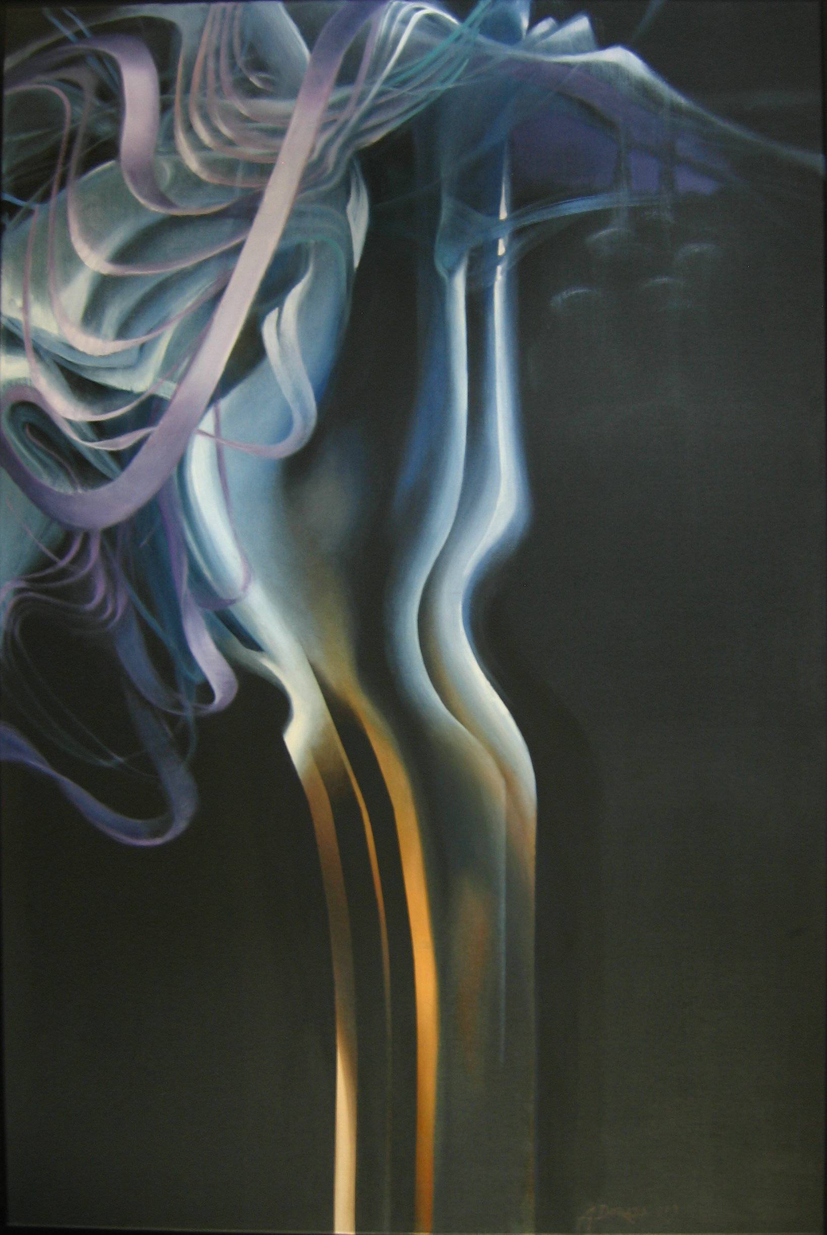 Obraz przedstawia abstrakcyjną kompozycję pełną płynnych, falujących linii i kształtów. Dominują chłodne odcienie niebieskiego i fioletowego, przeplatane ciepłymi akcentami złota. Te kolory zdają się tańczyć na niemal matowej, ciemnej powierzchni tła, tworząc wrażenie ruchu i głębi. Kompozycja przyciąga uwagę swoją dynamiką, jednocześnie zachowując pewną tajemniczość. Całość sprawia, że widz może poczuć się jak na granicy snu i jawy, z lekkim uczuciem niepewności, co obrazuje surrealistyczny charakter dzieła. Plamy barwne i linie przypominają mglistą wstęgę, która unosi się w ciszy. Atmosfera obrazu jest trochę jak "serenity", jakby sugerowała spokój, ale z subtelną nutą niepokoju. Techniki użyte przez artystę, być może aerograf i delikatne pociągnięcia pędzla, podkreślają jego wirtuozerię w operowaniu światłem i cieniem. To obraz, który wywołuje emocje, może nieco nostalgii, a może tęsknoty za czymś nieuchwytnym. Czasem spoglądam na takie dzieło i myślę sobie: "Wow, naprawdę lubię, jak te kolory się mieszają." Rysując takie linie, artysta tworzy coś, co przypomina mi senne obrazy. Dzieci mogą powiedzieć, że to wygląda jak magiczny dymek z bajki. Każdy może zobaczyć tu coś innego, bo właśnie na tym polega sztuka. Każda kreska i barwny akcent ma tu swoje miejsce, prowokując do refleksji nad tym, co naprawdę widzimy, a co chcemy zobaczyć. To trochę tak, jakby obraz mówił: "Zatrzymaj się na chwilę i zastanów, co tu się dzieje".
