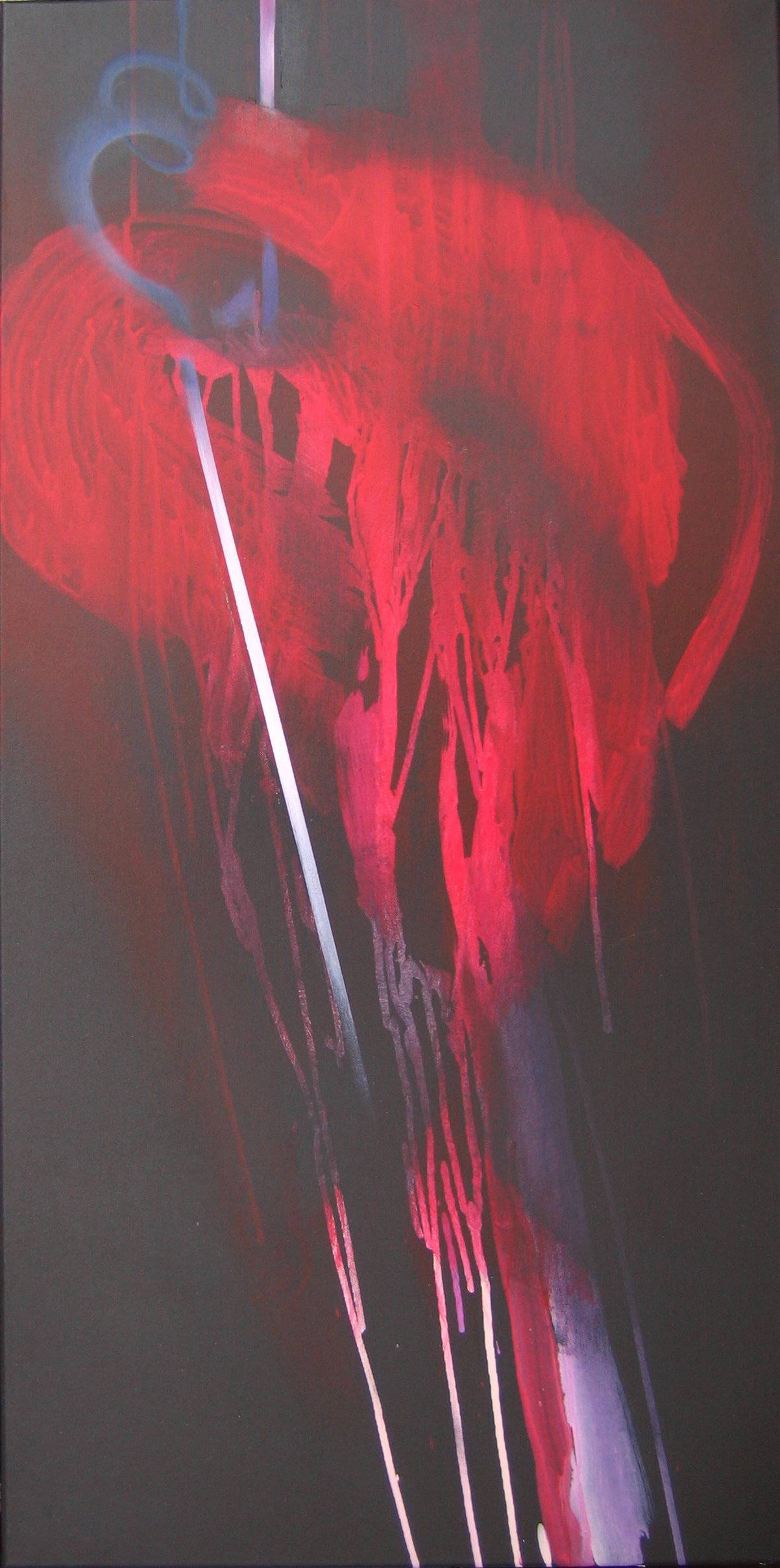 Na obrazie dominują intensywne czerwienie, które płynnie przechodzą w ciemne tony, tworząc dramatyczny kontrast. Przecięcie błękitem i odrobiną fioletu wprowadza nieoczekiwany twist kolorystyczny, sprawiając, że całość nabiera głębi. Kompozycja jest pełna dynamiki; linie są pociągnięte śmiało, niemal jakby ktoś pospiesznie rzucił farbą, ale z pewną precyzją. Atmosfera emanuje chaosem, a może i jakimś niepokojem. Wygląda trochę, jakby to obraz krzyczał. Pasuje tu słowo "intense". Styl obrazu mógłby kojarzyć się z ekspresjonizmem abstrakcyjnym. Artysta wykazał się brawurą, używając swobodnych pociągnięć pędzla oraz technik zbliżonych do action painting. To przypomina nieco eksperymenty Jacksona Pollocka, ukazując emocje bardziej niż konkretne formy. Dzieło może wywoływać szereg emocji: od zdumienia po niepokój. Patrząc na te dynamiczne czerwienie, czuję napięcie. Jakbym był świadkiem wyładowania na płótnie. Jest w tym coś niezwykłego. A wiesz co, powiedziałbym: "Ale to wygląda jak kosmos!" Naprawdę obraz, który zmusza do refleksji nad burzliwą naturą emocji i sztuki.