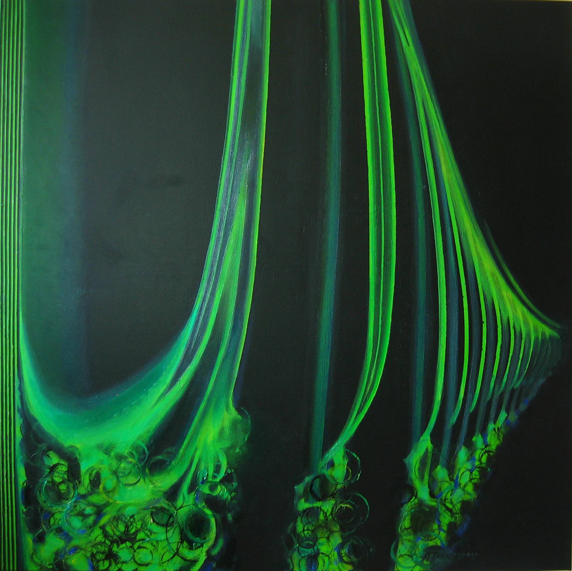 Obraz emanuje futurystycznym klimatem dzięki dominującym w nim odcieniom zieleni, która przypomina światło neonowe na tle głębokiej czerni. Smukłe kształty, przypominające rozwiewające się wstęgi, spływają z góry obrazu, tworząc efekt dynamiki i ruchu. Kompozycja jest harmonijna, a jednocześnie pełna tajemniczości. Cieniowanie i delikatne przejścia między kolorami tworzą wrażenie głębi. Cała scena wydaje się być jednocześnie spokojna i pełna ukrytej energii – jakby zza rogu zaraz miało pojawić się coś nieoczekiwanego. Styl artystyczny wskazuje na wpływy surrealizmu i abstrakcji, z wyraźnym naciskiem na grę światła i cienia. Technikami użytymi przez artystę są prawdopodobnie płynne pociągnięcia pędzla i warstwowe nakładanie farby, co daje obrazowi bardzo „cool” efekt glow. Dla mnie to obraz, który może symbolizować podróż – niekoniecznie w przestrzeni, ale może w emocjach czy myślach. Przywołuje na myśl refleksję nad nieuchwytnym pięknem chwili. Może to też być swoista wizja z innej planety, gdzie wszystko jest nieco inne, ale fascynująco przyciągające. Jako dziecko powiedziałbym, że to magiczna zielona rzeka, po której płyną marzenia. Cala kompozycja wydaje się pulsować, jakby była żywa i przemawiała do każdego, kto na nią patrzy.